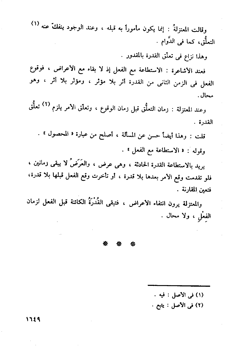 فعند الأشاعرة: الاستطاعة مع الفعل إذ لا بقاء مع الأعراض، فوقوع الفعل في الزمن الثاني من القدرة أثر بلا مؤثر، ومؤثر بلا أثر، وهو محال ز