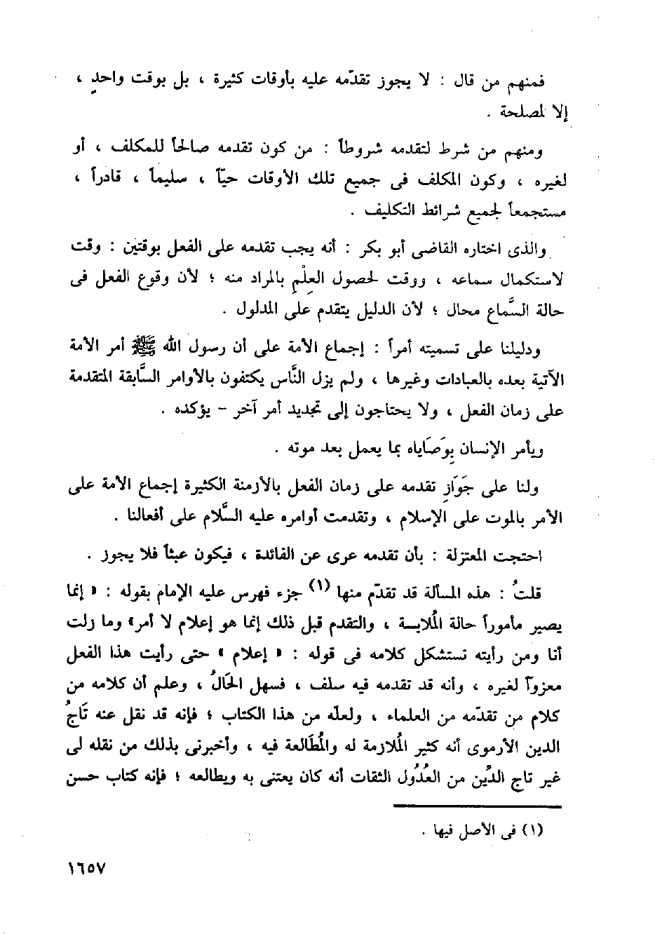 قلت: هذه المسألة قد تقدم منها جزء فهرس عليه الإمام بقوله: " إنما يصير مأمورا حالة الملابسة، والتقدم قبل ذلك إنما هو إعلام لا أمر " وما زلت أنا ومن رأيته نستشكل كلامه في قوله: (إعلام) حتى رأيت هذا الفعل معزوا لغيره، وأنه قد تقدمه فيه سلف، فسهل الحال، وعلم أن كلامه من كلام من تقدمه من العلماء، ولعله من هذا الكتاب؛ فإنه قد نقل عنه تاج الدين الأرموي أنه كثير الملازمة له والمطالعة فيه، وأخبرني بذلك من نقله لي غير تاج الدين من المعدول الثقات أنه كان يعتني به ويطالعه؛ فإنه كتاب حسن.