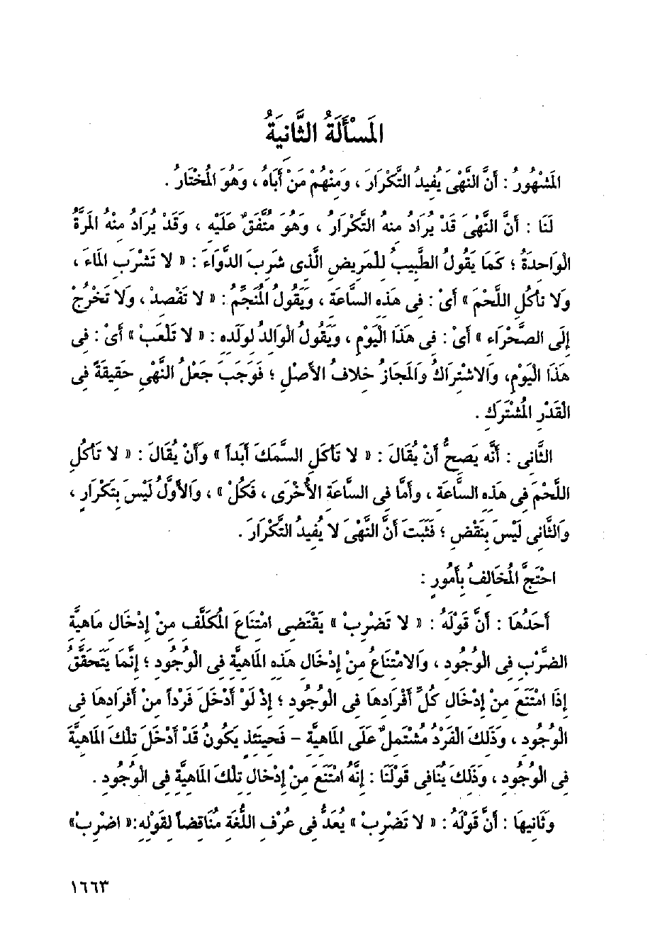 أحدها: أن قوله: (لا تضرب) يقتضي امتناع المكلف من إدخال ماهية الضرب في الوجود، والامتناع من إدخال هذه الماهية في الوجود؛ إنما يتحقق إذا امتنع من إدخال كل أفرادها في الوجود؛ إذ لو أدخل فردا من أفرادها في الوجود، وذلك الفرد مشتمل على الماهية - فحينئذ يكون قد أدخل تلك الماهية في الوجود، وذلك ينافي قولنا: إنه امتنع من إدخال تلك الماهية في الوجود.