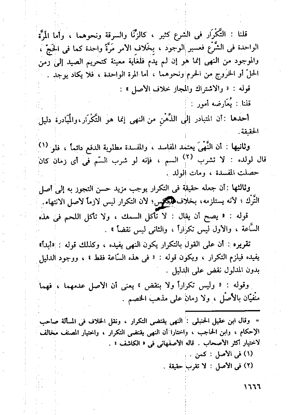 قوله: " يصح أن يقال: لا تأكل السمك، ولا تأكل اللحم في هذه الساعة، والأول ليس تكرارا، والثاني ليس نقضا ً ".