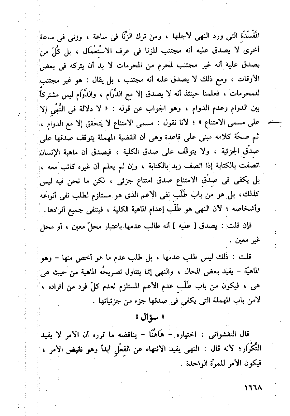 قلت: ذلك ليس طلب عدمها، بل طلب عدم ما هو أخص منها - وهو الماهية - يفيد بعض المحال، والنهي إنما يتناول تصريحه الماهية من حيث هي هي، فيكون من باب طلب عدم الأعم المستلزم لعدم كل فرد من أفراده، لا من باب المهلة التي يكفي في صدقها جزء من جزئياتها.