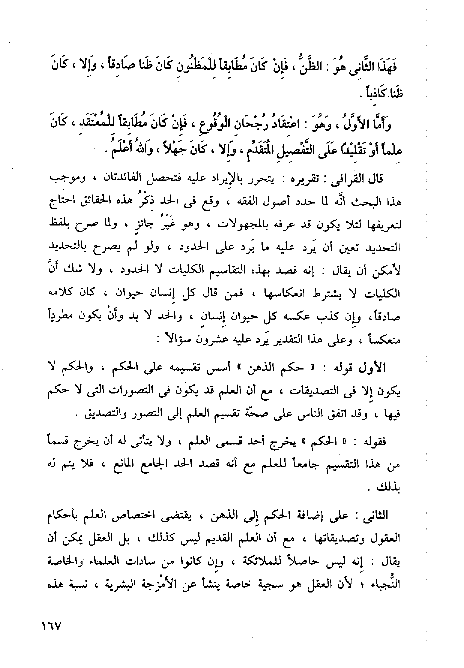 قال القرافي: تقريره: يتحرر بالإيراد عليه فتحصل الفائدتان، وموجب هذا البحث أنه لما حدد أصول الفقه، وقع في الحد ذِكُرُ هذه الحقائق احتاج لتعيرفها لئلا يكون قد عرفه بالمجهولات، وهو غير جائز، ولما صرح بلفظ التحديد تعين أن يرد عليه ما يرد على الحدود، ولو لم يصرح بالتحديد لأمكن أن يقال: إنه قصد بهذه التقاسيم الكليات لا الحدود، ولا شك أنَّ الكليات لا يشترط انعكاسها، فمن قال كل إنسان حيوان، كان كلامه صادقا، وإن كذب عكسه كل حيوان إنسان، والحد لا بد وأن يكون مطردًا منعكسا، وعلى هذا التقدير يرد عليه عشرون سؤالا: