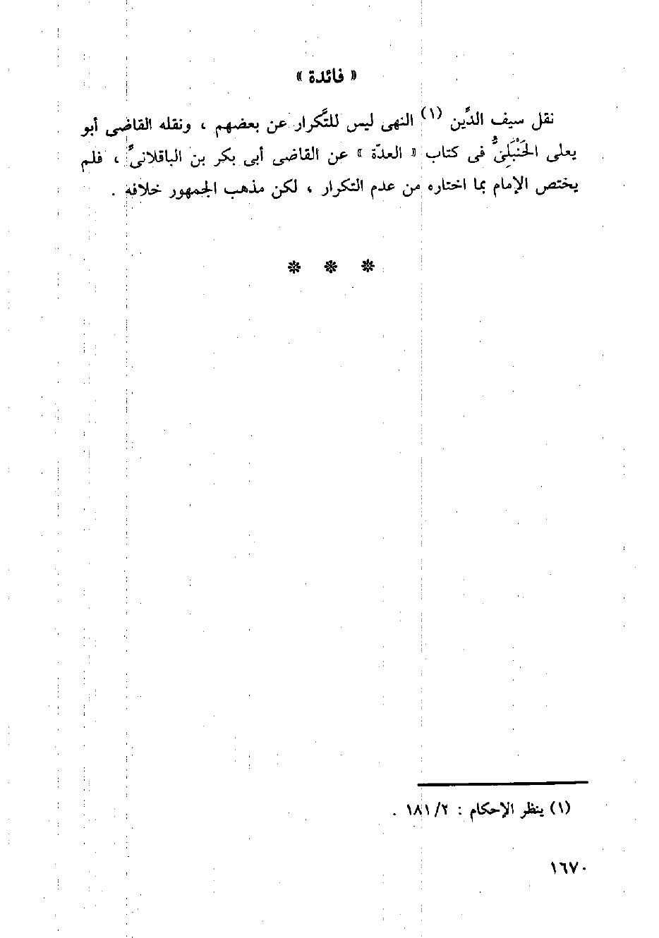 نقل سيف الدين النهي ليس للتكرار عن بعضهم، ونقله القاضي أبو يعلى الحنبلي في كتاب (العدة) عن القاضي أبي بكر بن الباقلاني، فلم يختص الإمام بما اختاره من عدم التكرار، لكن مذهب الجمهور خلافه.