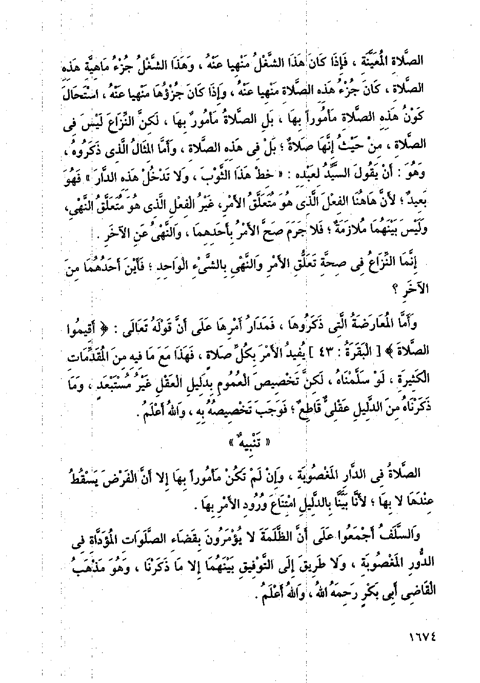 الصلاة المعينة، فإذا كان هذا الشغل منهيا عنه، وهذا الشغل جزء ماهية هذه الصلاة، كان جزء هذه الصلاة منهيا عنه، وإذا كان جزاؤها منهيا عنه، استحال كون هذه الصلاة مأمورا بها، بل الصلاة مامور بها، لكن النزاع ليس في الصلاة، من حيث إنها صلاة؛ بل في هذه الصلاة، وأما المثال الذي ذكروه، وهو: أن يقول السيد لعبده: " خط هذ االثوب، ولا تدخل هذه الدار " فهو بعيد؛ لأن هاهنا الفعل الذي هو متعلق الأمر، غير الفعل الذي هو متعلق النهي، وليس بينهما ملازمة؛ فلا جرم صح الأمر بأحدهما، والنهي عن الآخر.
