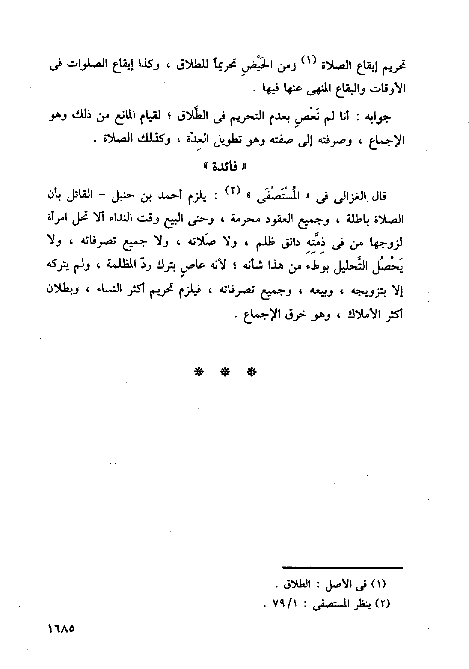قال الغزالي في (المستصفى): يلزم أحمد بن حنبل - القائل بأن الصلاة باطلة، وجميع العقود محرمة، وحتى البيع وقت النداء ألا تحل امرأة لزوجها من في ذمته دانق ظلم، ولا صلاته، ولا جميع تصرافته، ولا يحصل التحليل بوطء من هذا شانه؛ لأنه عاص بترك رد المظلمة، ولم يتركه إلا بتزويجه، وبيعه، وجميع تصرافته، فيلزم تحريم أكثر النساء وبطلان أكثر الأملاك، وهو خرق الإجماع.