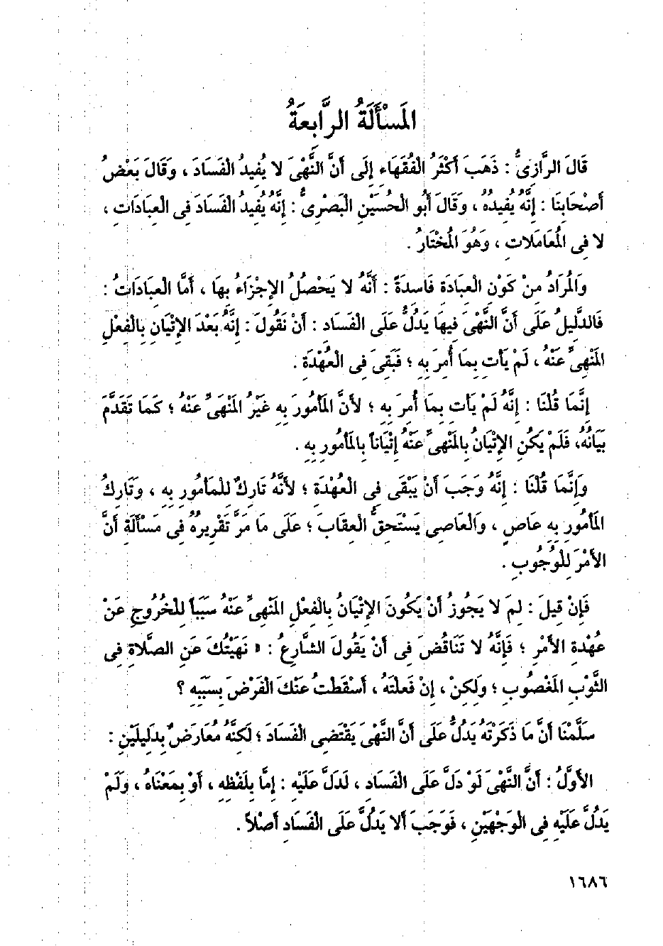 قال الرازي: ذهب أكثر الفقهاء غلى أن النهي لا يفيد الفساد، وقال بعض أصحابنا: إنه يفيده، وقال أبو الحسين البصري: إنه يفيد الفساد في العبادات، لا في المعاملات، وهو المختار.