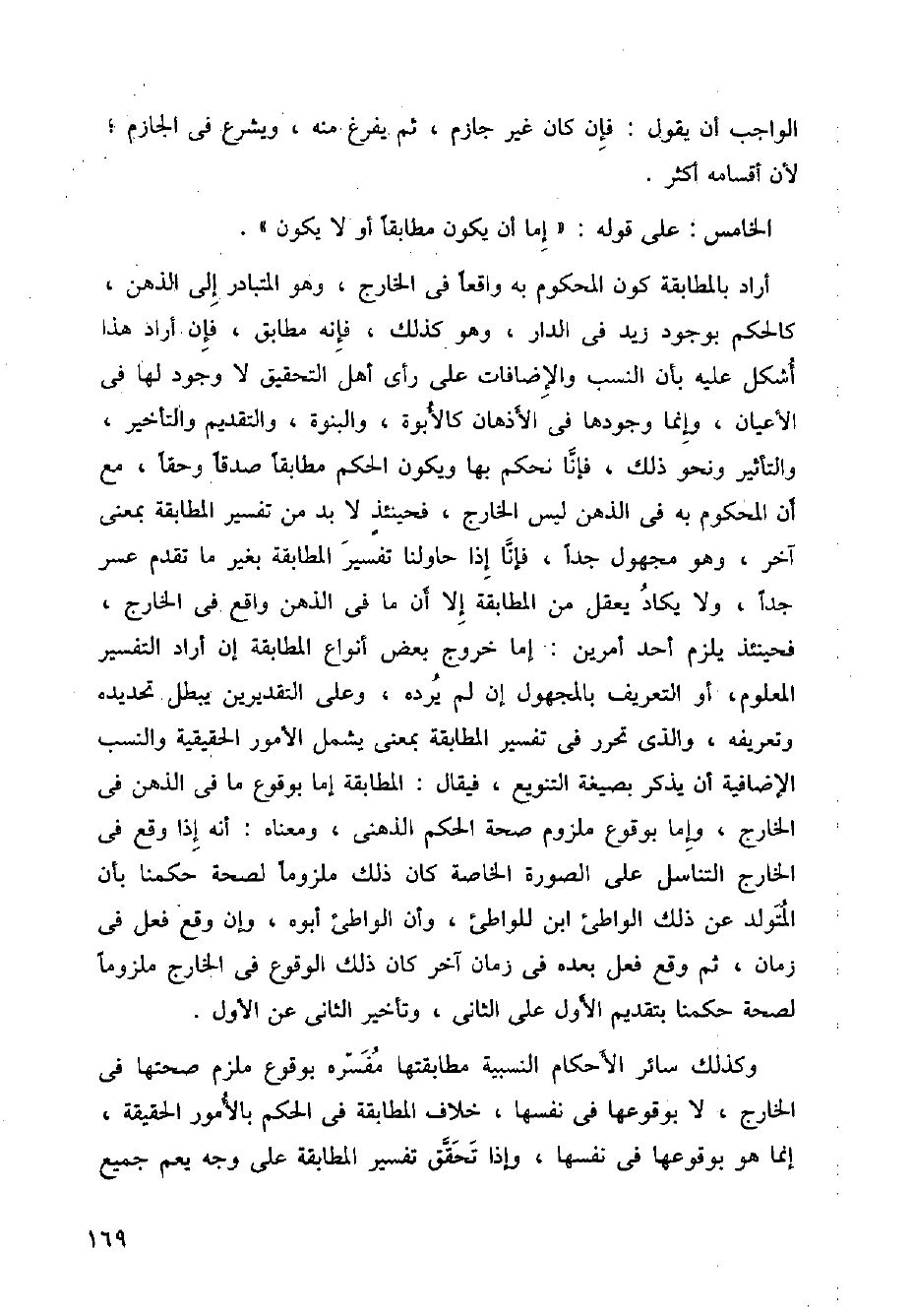 إما خروج بعض أنواع المطابقة إن أراد التفسير المعلوم، أو التعريف بالمجهول إن لم يرده، وعلى التقديرين يبطل تحديده وتعريفه، والذي تحرر في تفسير المطابقة بمعنى يشمل الأمور الحقيقة والنسب الإضافية أن يذكر بصيغة التنويع، فيقال: المطابقة إما بوقوع ما في الذهن في الخارج التناسل على الصورة الخاصة كان ذلك ملزوما لصحة حكمنا بأن المتولد عن ذلك الواطئ ابن للواطئ، وأن الواطئ أبوه، وإن وقع فعل زمان، ثم وقع فعل بعده في زمان آخر كان ذلك الوقوع في الخارج ملزوما، لصحة حكمنا بتقديم الأول على الثاني، وتأخير الثانى عن الأول.