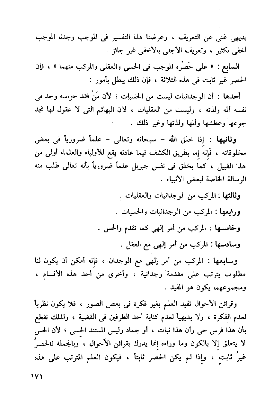 السابع: ((على حصره الموجب في الحسى والعقلى والمركب منهما))، فإن الحصر غير ثابت في هذه الثلاثة، فإن ذلك يبطل بأمور: