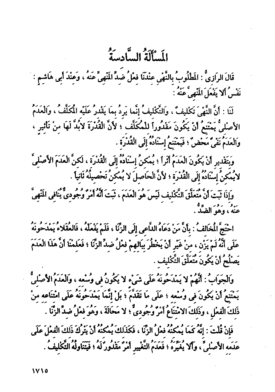 احتج المخالف: بأن من دعاه الداعي إلى الزنا، فلم يفعله، فالعقلاء يمدحونه على أنه لم يزن، من غير أن يخطر ببالهم فعل ضد الزنا؛ فعلمنا أن هذا العدم يصلح أن يكون متعلق التكليف.
