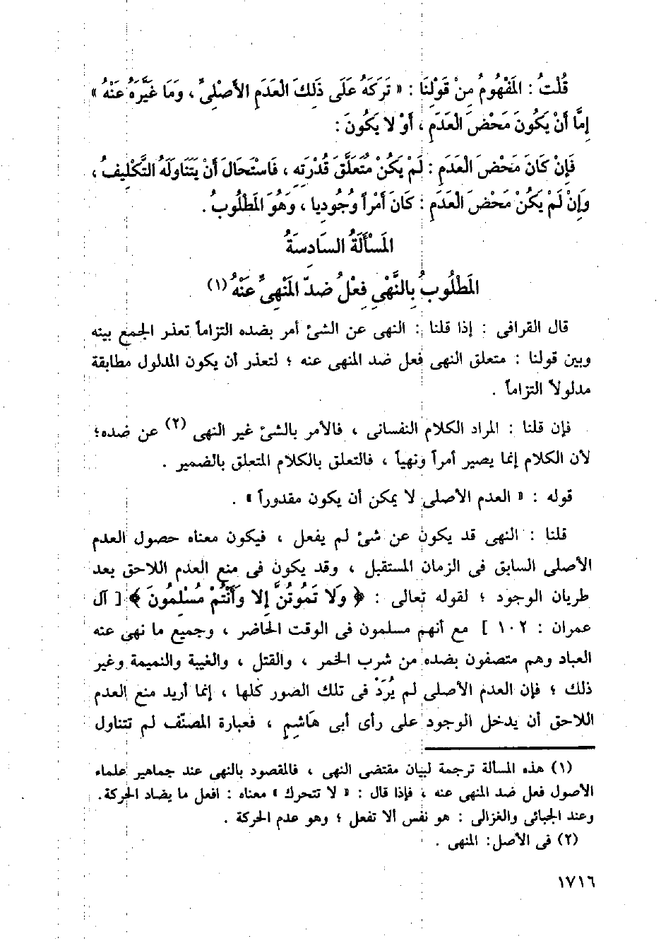 قلنا: النهي قد يكون عن شيء لم يفعل، يكون معناه حصول العدم الأصلي السابق في الزمان المستقبل، وقد يكون في منع العدم اللاحق بعد طريان الوجود؛ لقوله تعالى: {ولا تموتن إلا وأنتم مسلمون} [آل عمران: 102] مع أنهم مسلمون في الوقت الحاضر، وجميع ما نهي عنه العباد وهم متصفون بضده من شرب الخمر، والقتل، والغيبة والنميمة وغير ذلك؛ فإن العدم الأصلي لم يرد في تلك الصور كلها، إنما أريد منع العدم اللاحق أن يدخل الوجود على رأي أبي هاشم، فعبارة المصنف لم تتناول