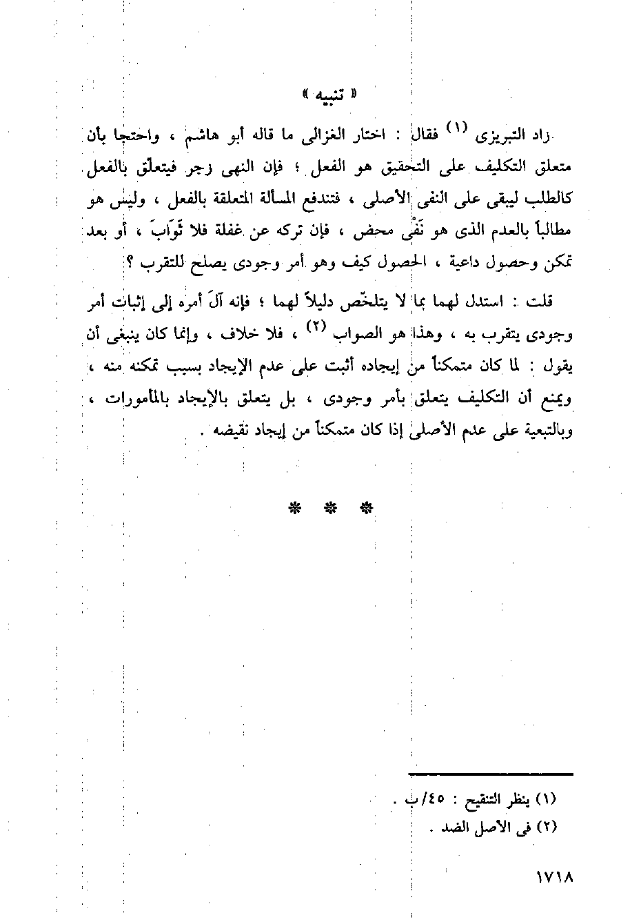 زاد التبريزي فقال: اختار الغزالي ما قاله أبو هاشم، واحتجا بأن متعلق التكليف على التحقيق هو الفعل؛ فإن النهي زجر فيتعلق بالفعل كالطلب ليبقى على النفي الأصلي، فتندفع المسألة المتعلقة بالفعل، وليس هو مطالبا بالعدم الذي هو نفي محض، فإن تركه عن غفلة فلا ثواب، أو بعد تمكن وحصول داعية، الحصول كيف وهو أمر وجودي يصلح للتقرب؟