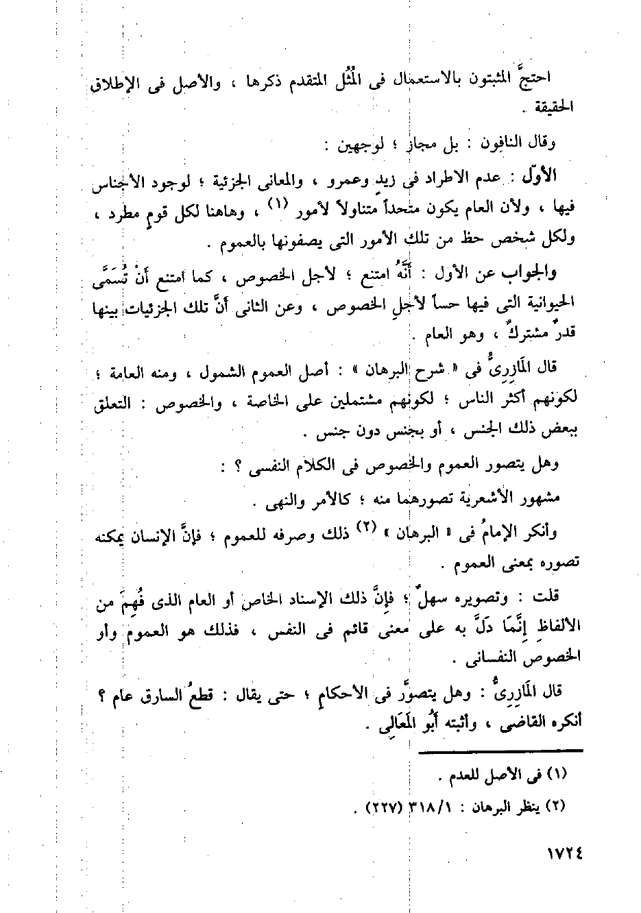 الأول: عدم الاطراد في زيد وعمرو، والمعاني الجزئية؛ لوجود الأجناس فيها، ولأن العام يكون متحدا متناولا لأمور، وهاهنا لكل قوم مطرد، ولكل شخص حظ من تلك الأمور التي يصفونها بالعموم.
