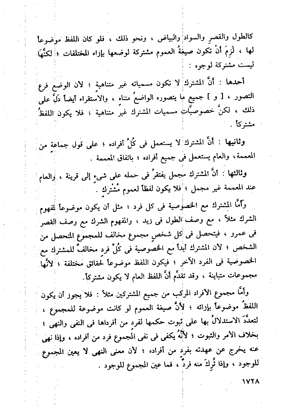 احدها: أن المشترك لا تكون مسمياته غير متناهية؛ لأن الوضع فرع التصور، [و] جميع ما يتصوره الواضع متناه، والاستقراء أيضا دل على ذلك، لكن خصوصيات مسميات المشترك غير متناهية؛ فلا يكون اللفظ مشتركا.