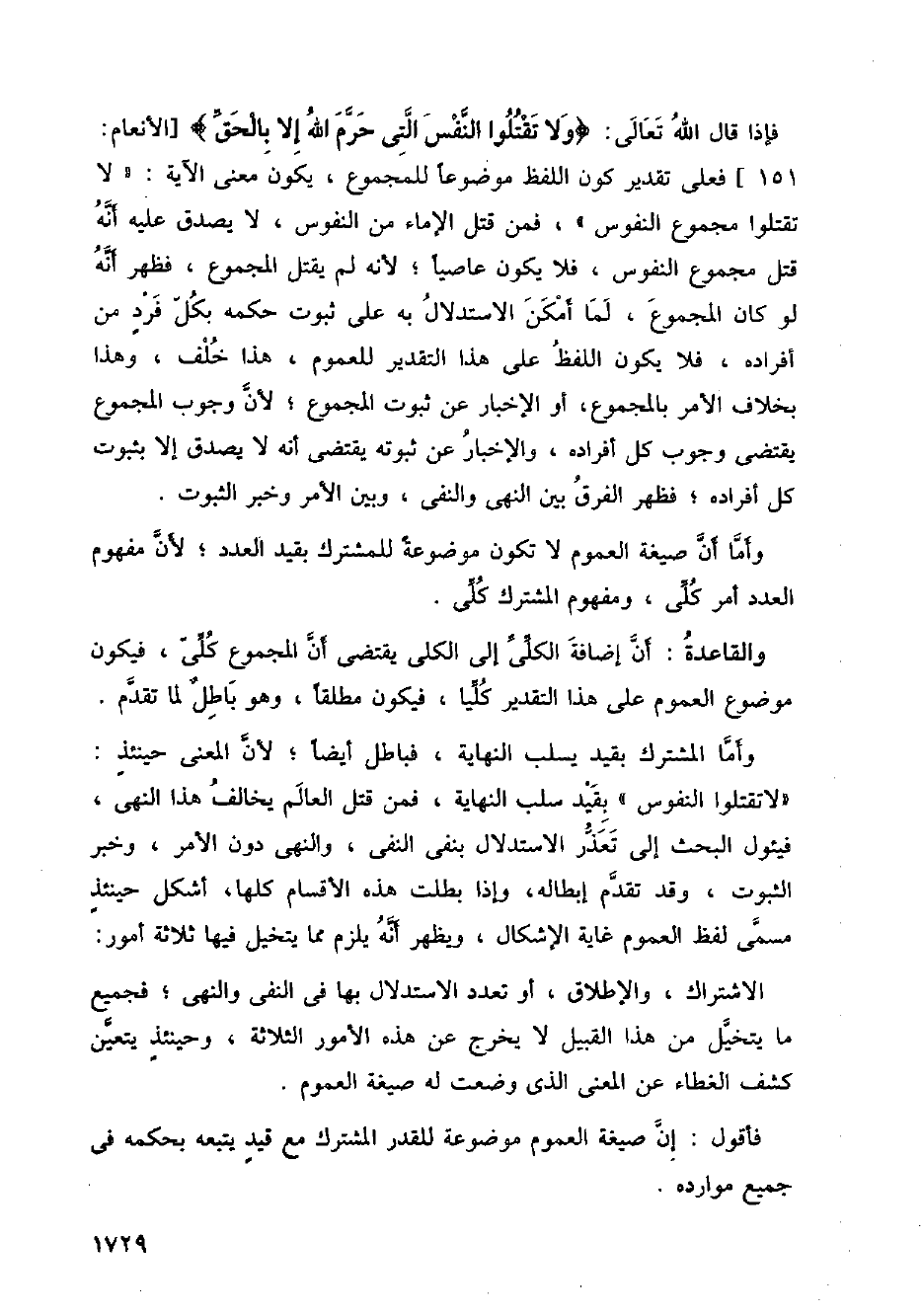 فإذا قال الله تعالى: {ولا تقتلوا النفس التي حرم الله إلا بالحق} [الأنعام: 151] فعلى تقدير كون اللفظ موضوعا للمجموع، يكون معنى الآية: " لا تقتلوا مجموع النفوس "، فمن قتل الإماء من النفوس، لا يصدق عليه أنه قتل مجموع النفوس، فلا يكون عاصيا؛ لانه لم يقتل المجموع، فظهر أنه لو كان المجموع، لما أمكن الاستدلال به على ثبوت حكمه بكل فرد من افراده، فلا يكون اللفظ على هذا التقدير للعموم، هذا خلف، وهذا بخلاف الأمر بالمجموع، او الإخبار عن ثبوت المجموع؛ لأن وجوب المجموع يقتضي وجوب كل افراده، والإخبار عن ثبوته يقتضي أنه لا يصدق إلا بثبوت كل أفراده؛ فظهر الفرق بين النهي والنفي، وبين الأمر وخبر الثبوت.