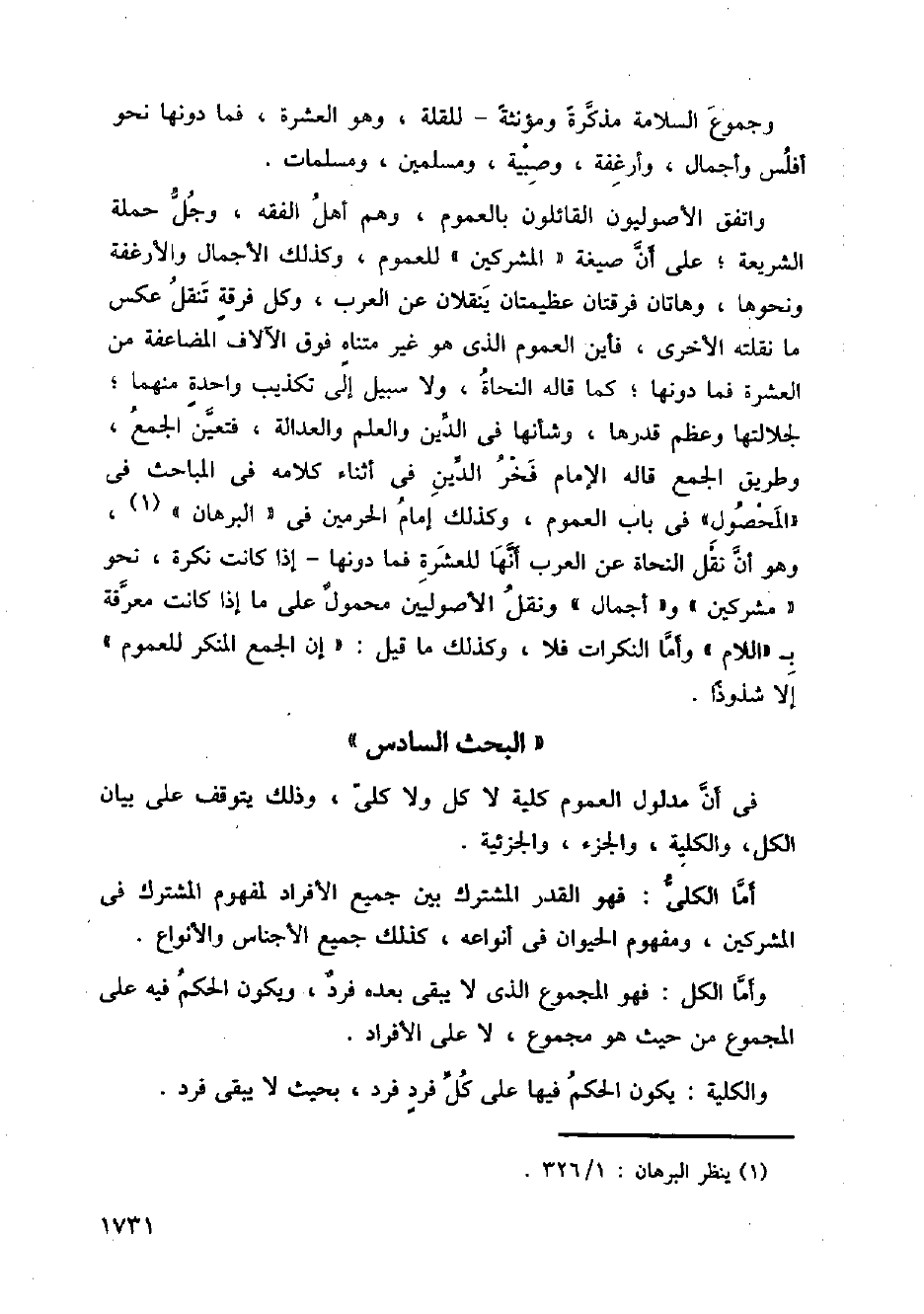 واتفق الأصوليون القائلون بالعموم، وهم أهل الفقه، وجل حملة الشريعة؛ على أن صيغة (المشركين) للعموم، وكذلك الأجمال والأرغفة ونحوها، وهاتان فرقتان عظيمتان ينقلان عن العرب، وكل فرقة تنقل عكس ما نقلته الأخرى، فاين العموم الذي هو غير متناه فوق الآلاف المضاعفة من العشرة فما دونها؛ كما قاله النحاة، ولا سبيل إلى تكذيب واحدة منهما؛ لجلالتها وعظم قدرها، وشأنها في الدين والعلم والعدالة، فتعين الجمع، وطريق الجمع قاله الإمام فخر الدين في أثناء كلامه في المباحث في (المحصول) في باب العموم، وكذلك إمام الحرمين في (البرهان)، وهو أن نقل النحاة عن العرب أنها للعشرة فما دونها - إذا كانت نكرة، نحو (مشركين) و (أجمال) ونقل الأصوليين محمول على ما إذا كانت معرفة بـ (اللام) وأما النكرات فلا، وكذلك ما قيل: " إن الجمع المنكر للعموم " إلا شذوذا.