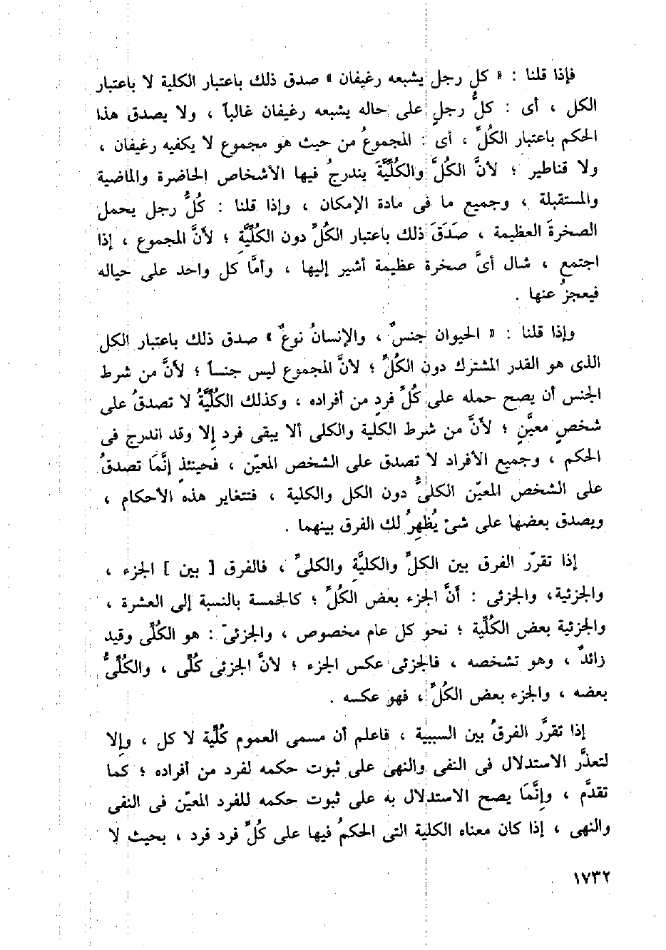 فإذا قلنا: " كل رجل يشبعه رغيفان " صدق ذلك باعتبار الكلية لا باعتبار الكل، أي: كل رجل على حالة يشبعه رغيفان غالبا، ولا يصدق هذا الحكم باعتبار الكل، اي: المجموع من حيث هو مجموع لا يكفيه رغيفان، ولا قناطير؛ لا، الكل والكلية يندرج فيها الأشخاص الحاضرة والماضية والمستقبلة، وجميع ما في مادة الإمكان، وإذا قلنا: كل رجل يحمل الصغرة العظيمة، صدق ذلك باعتبار الكل دون الكلية، لأن المجموع، إذا اجتمع، شال أي صخرة عظيمة أشير إليها، واما كل واحد على حياله فيعجز عنها.