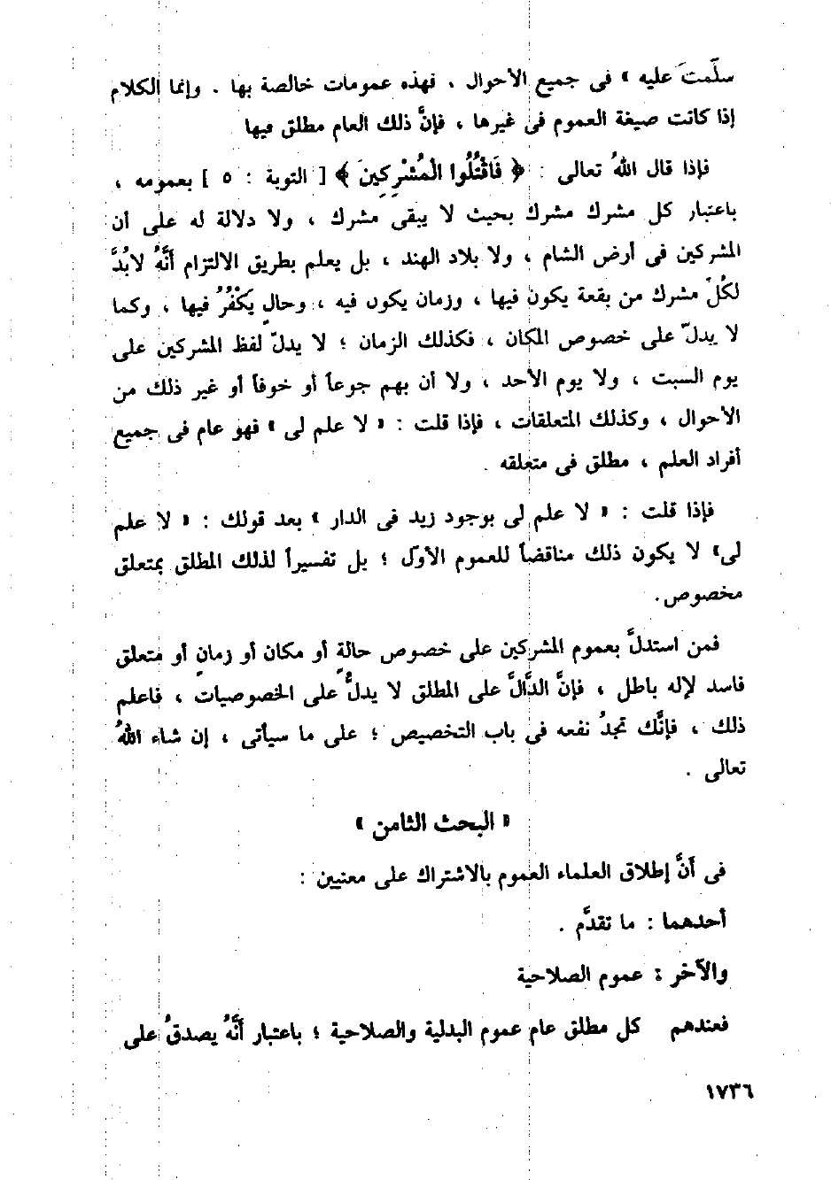 فمن استدل بعموم المشركين على خصوص حالة أو مكان أو زمان أو متعلق فاسد لإله باطل، فإن الدال على المطلق لا يدل على الخصوصيات، فاعلم ذلك، فإنك تجد نفعه في باب التخصيص؛ على ما سيأتي، إن شاء الله تعالى.