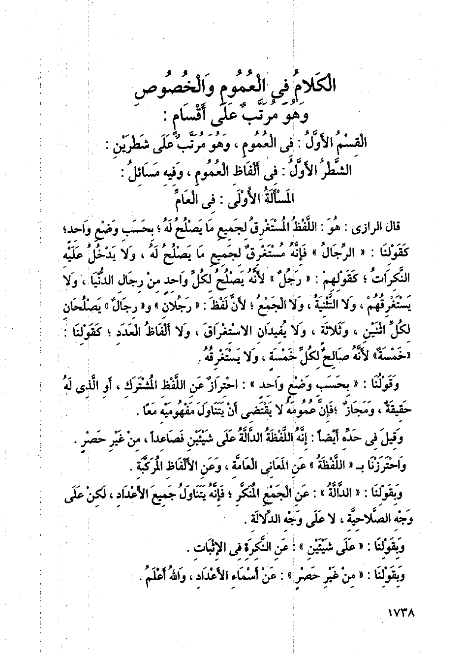 قال الرازي: هو: اللفظ المستغرق لجميع ما يصلح له؛ بحسب وضع واحد؛ كقولنا: (الرجال) فإنه مستغرق لجميع ما يصلح له، ولا يدخل عليه النكرات؛ كقولهم: (رجل) لأنه يصلح لكل واحد من رجال الدنيا، ولا يستغرقهم، ولا التثنية، ولا الجمع؛ لأن لفظ: (رجلان) و (رجال) يصلحان لكل اثنين، وثلاثة، ولا يفيدان الاستغراق، ولا ألفاظ العدد؛ كقولنا: (خمسة) لأنه صالح لكل خمسة ولا يستغرقه.