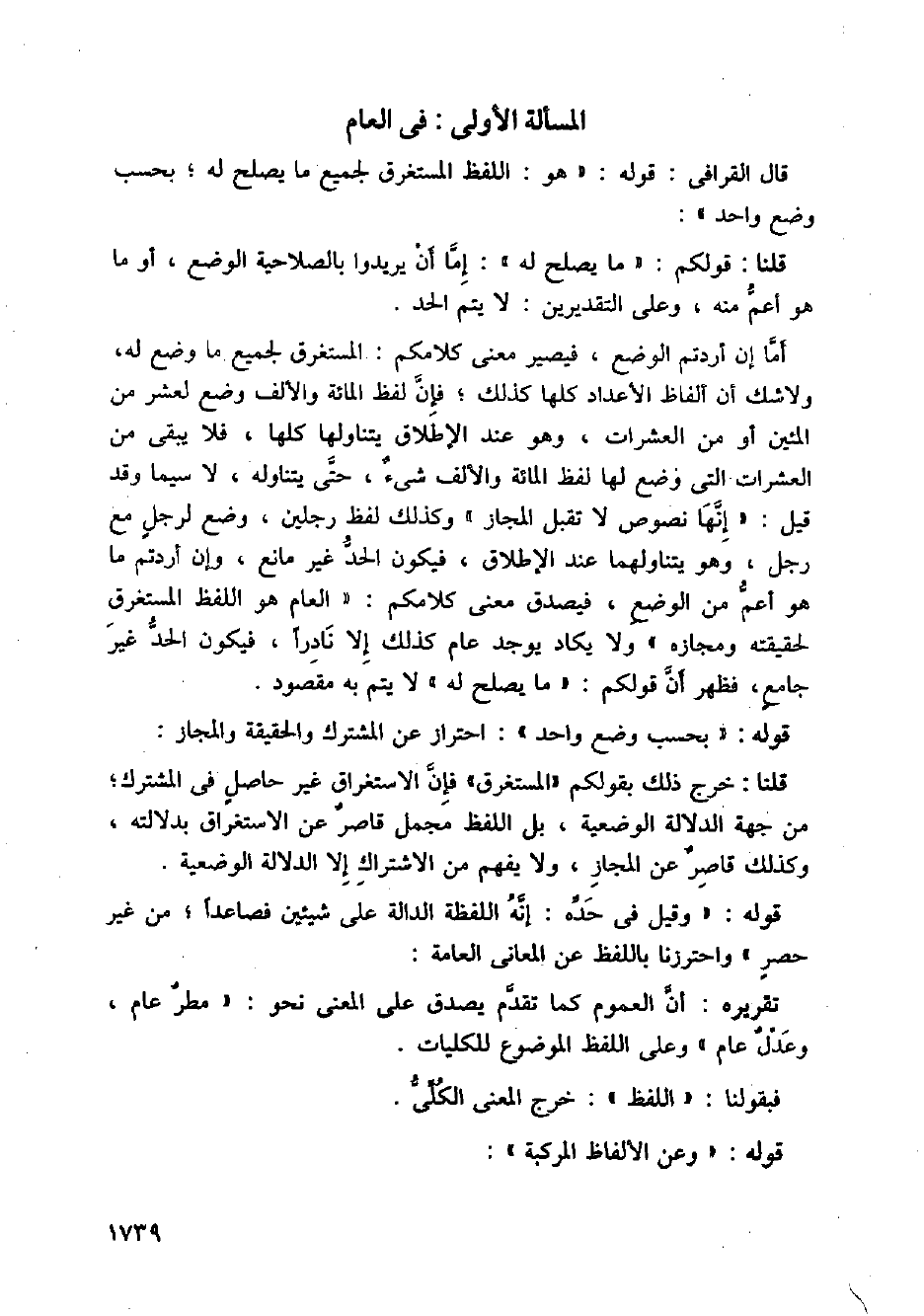 اما إن أردتم الوضع، فيصير معنى كلامكم: المستغرق لجميع ما وضع له، ولا شك أن ألفاظ الأعداد كلها كذلك؛ فإن لفظ المائة والألف وضع لعشر من المئين أو من العشرات، وهو عند الإطلاق يتناولها كلها، فلا يبقى من العشرات التي وضع لها لفظ المائة والألف شيء، حتى يتناوله، لا سيما وقد قيل: " إنها نصوص لا تقبل المجاز " وكذلك لفظ رجلين، وضع لرجل مع رجل، وهو يتناولهما عند الإطلاق، فيكون الحد غير مانع، وإن اردتم ما هو أعم من الوضع، فيصدق معنى كلامكم: " العام هو اللفظ المستغرق لحقيقته ومجازه " ولا يكاد يوجد عام كذلك إلا نادرا، فيكون الحد غير جامع، فظهر أن قولكم: " ما يصلح له " لا يتم به مقصود.