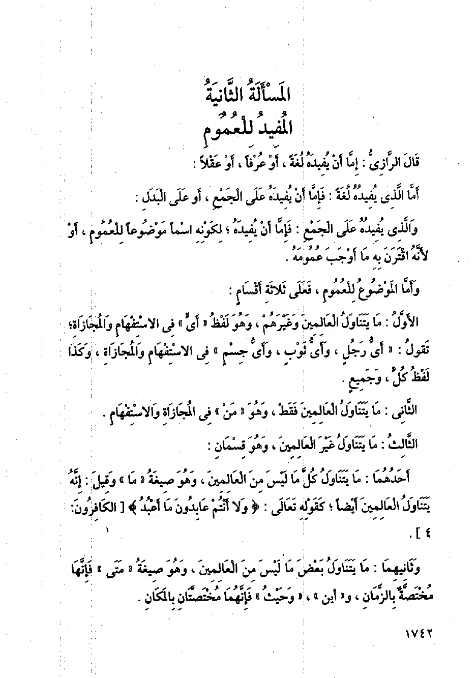 الأول: ما يتناول العالمين وغيرهم، وهو لفظ (أي) في الاستفهام والمجازاة؛ تقول: " اي رجل، وأي ثوب، وأي جسم " في الاستفهام والمجازاة، وكذا لفظ كل، وجميع.