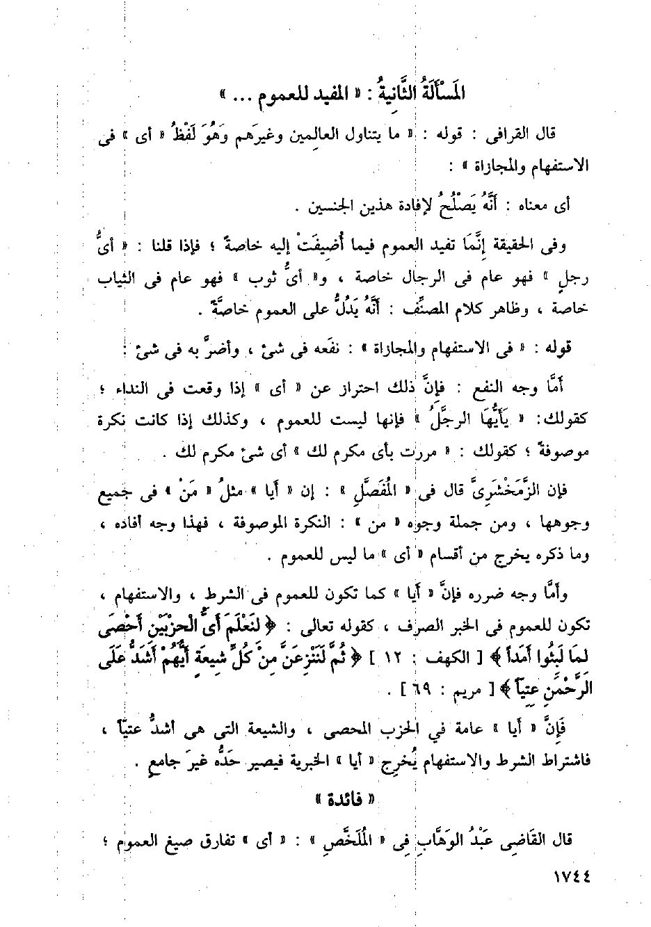 قال القرافي: قوله: " ما يتناول العالمين وغيرهم وهو لفظ (أي) في الاستفهام والمجازاة ":