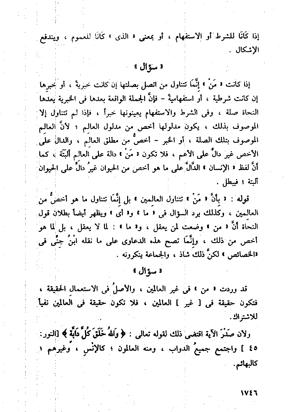 قوله: " بأن (من) تناول العالمين " بل إنما تتناول ما هو اخص من العالمين، وكذلك يرد السؤال في (ما) و (أي) ويظهر ايضا بطلان قول النحاة ان (من) وضعت لمن يعقل، (ما): لما لا يعقل، بل لما هو اخص من ذلك، وإنما تصح هذه الدعاوي على ما نقله ابن جني في (الخصائص) لكن ذلك شاذ، والجماعة ينكرونه.
