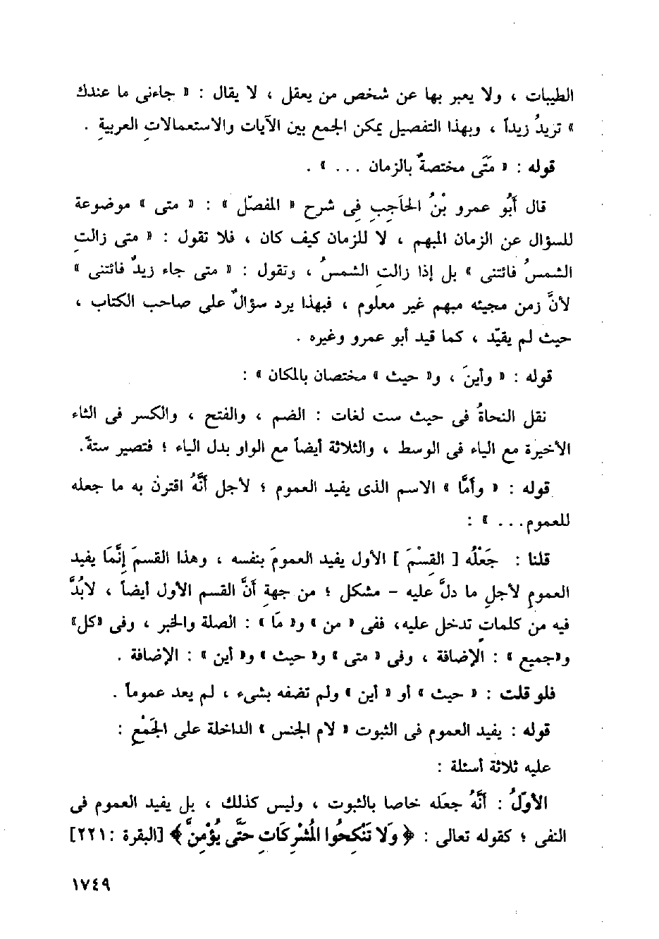 قلنا: جعله (القسم) الأول يفيد العموم بنفسه، وهذا القسم إنما يفيد العموم لأجل ما دل عليه - مشكل؛ من جهة أن القسم الأول ايضا، لابد فيه من كلمات تدخل عليه، ففي (من) و (ما): الصلة والخبر، وفي (كل) و (جميع): الإضافة، وفي (متى) و (حيث) و (أين): الإضافة.