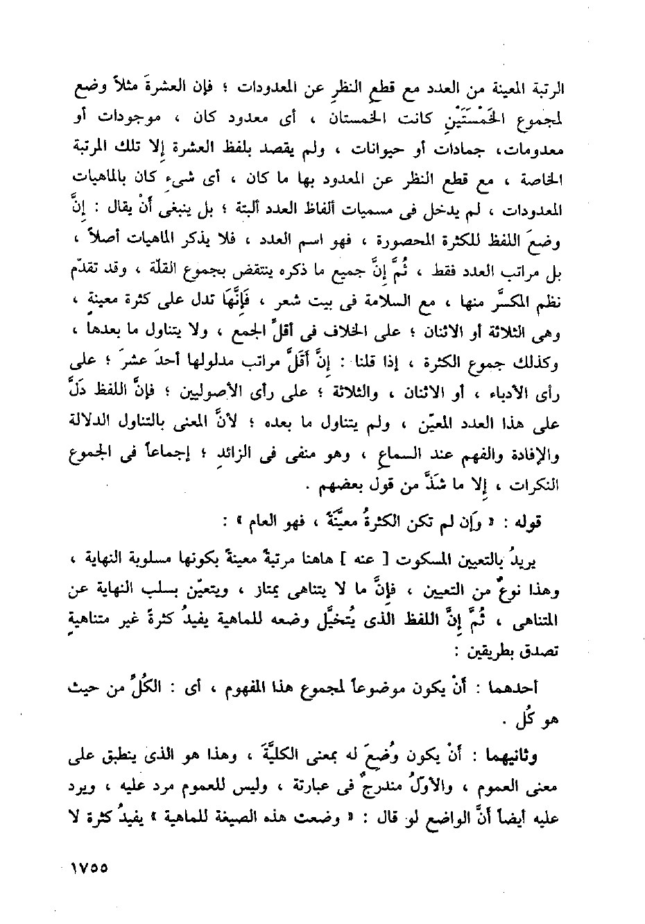الرتبة المعينة من العدد مع قطع النظر عن المعدودات؛ فإن العشرة مثلا وضع لمجموع الخمستين كانت الخمستان، أي معدود كان، موجودات أو معدومات، جمادات أو حيوانات، ولم يقصد بلفظ العشرة غلا تلك المرتبة الخاصة، مع قطع النظر عن المعدود بها ما كان، أي شيء كان بالماهيات المعدودات، لم يدخل في مسميات ألفاظ العدد ألبتة؛ بل ينبغي أن يقال: إن وضع اللفظ للكثرة المحصورة، فهو اسم العدد، فلا يذكر الماهيات أصلا، بل مراتب العدد فقط، ثم إن جميع ما ذكره ينتقض بمجموع القله، وقد تقدم نظم المكسر منها، مع السلامة في بيت شعر، فإنها تدل على كثرة معينة، وهي الثلاثة أو الاثنان؛ على الخلاف في أقل الجمع، ولا يتناول ما بعدها، وكذلك جموع الكثرة، إذا قلنا: إن أقل مراتب مدلولها أحد عشر؛ على رأي الأدباء، أو الاثنان، والثلاثة؛ على رأي الأصوليين؛ فإن اللفظ دل على هذا العدد المعين، ولم يتناول ما بعده؛ لأن المعنى بالتناول الدلالة والإفادة والفهم عند السماع، وهو منفي في الزائد؛ إجماعا في الجموع النكرات، إلا ما شذ من قول بعضهم.