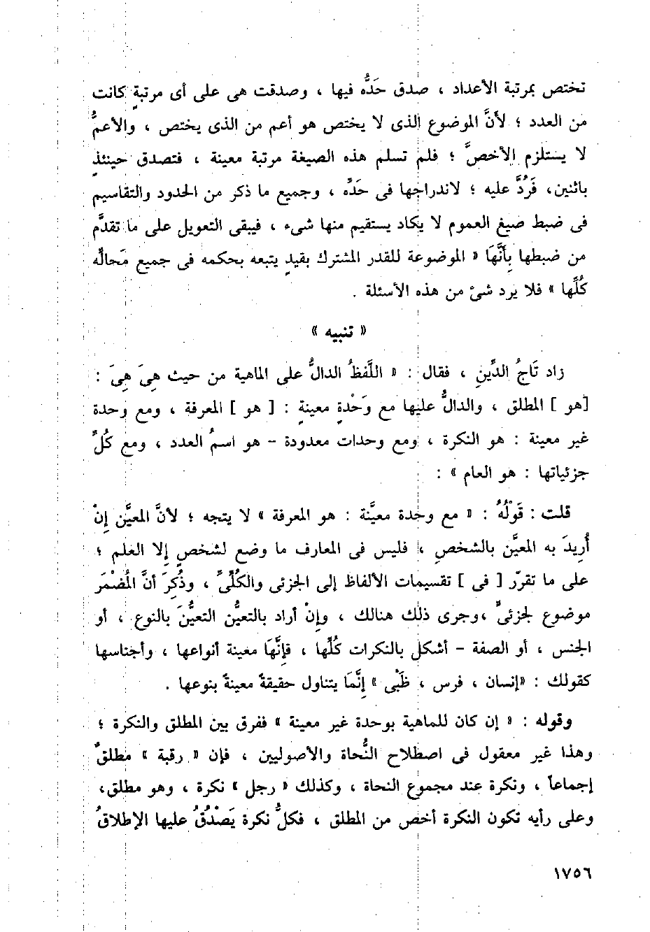 زاد تاج الدين، فقال: " اللفظ الدال على الماهية من حيث هي هي: (هو) المطلق، والدال عليها مع وحدة معينة: (هو) المعرفة، ومع وحدة غير معينة: هو النكرة، ومع وحدات معدوده - هو اسم العدد، ومع كل جزئياتها: هو العام ":