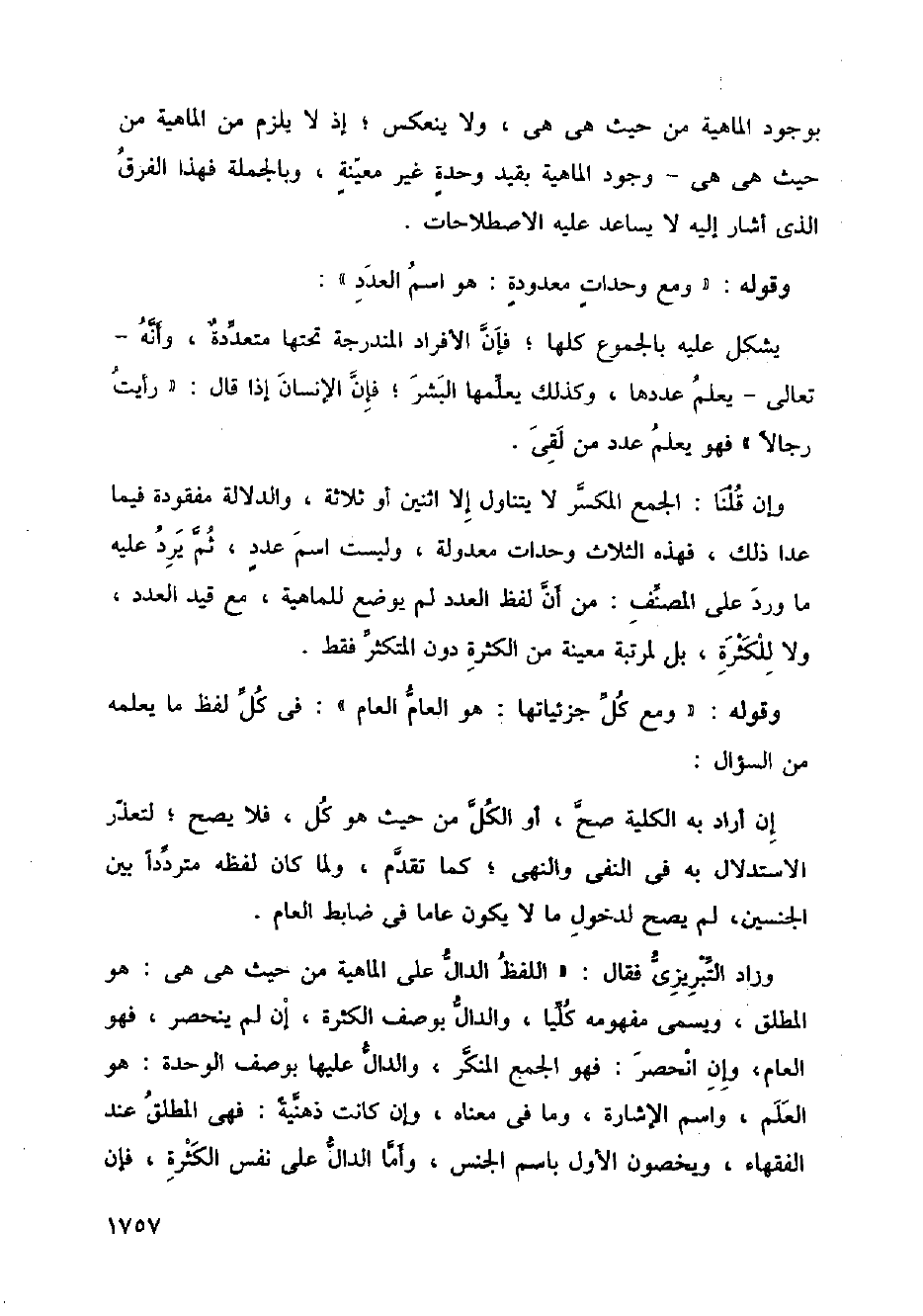 وزاد التبريزي فقال: " اللفظ الدال على الماهية من حيث هي هي: هو المطلق، ويسمى مفهومه كليا، والدال بوصف الكثرة، إن لم ينحصر، فهو العام، وإن انحصر: فهو الجمع المنكر، والدال عليها بوصف الوحدة: ÷والعلم، واسم الغشارة، وما في معناه، وإن كانت ذهنية: فهي المطلق عند الفقهاء، ويخصون الأول باسم الجنس، وأما الدال على نفس الكثرة، فإن