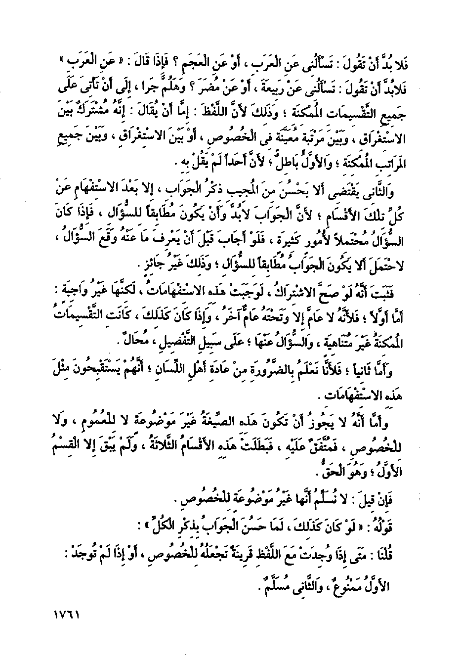 فثبت أنه لو صح الاشتراك، لو جبت هذه الاستفهامات، لكنها غير واجبة: أما أولا؛ فلأنه لا عام إلا وتحته عام آخر، وإذا كان كذلك، كانت التقسيمات الممكنة غير متناهية، والسؤال عنها؛ على سبيل التفصيل، محال.
