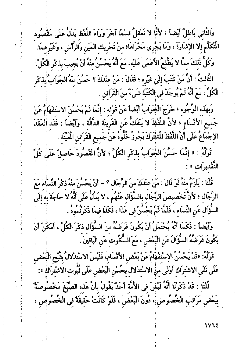 قلنا: يلزم منه لو قال: من عندك من الرجال؟ - أن يحسن منه ذكر النساء مع الرجال؛ لأن تخصيص الرجال بالسؤال عنهم، لا يدل على أنه لا حاجة به إلى السؤال عن النساء، فلما لم يحسن في هذا فكذا فيما ذكرتموه.