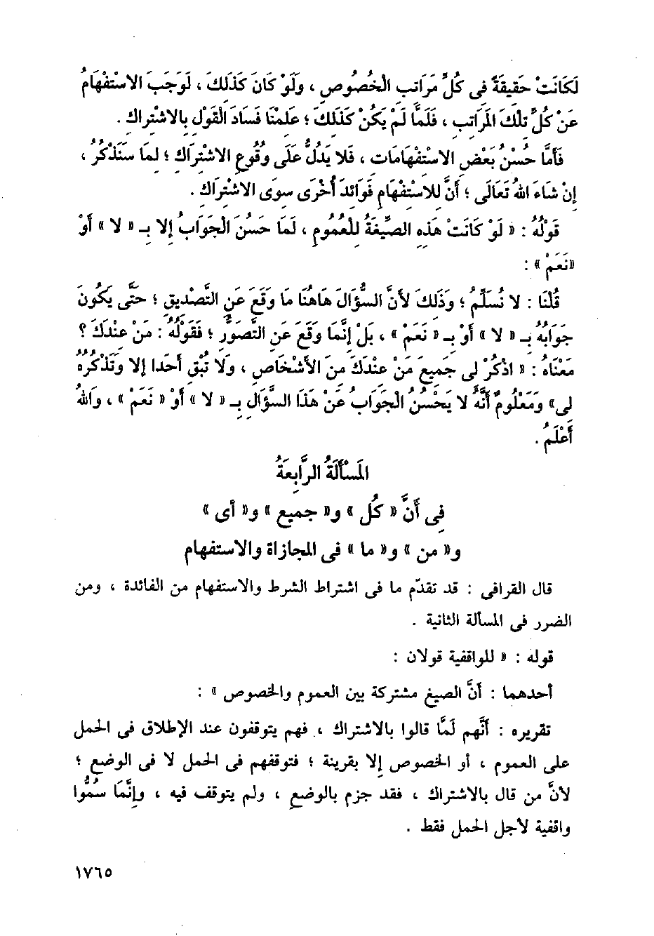 قال القرافي: قد تقدم ما في اشتراط الشرط والاستفهام من الفائدة، ومن الضرر في المسألة الثانية.