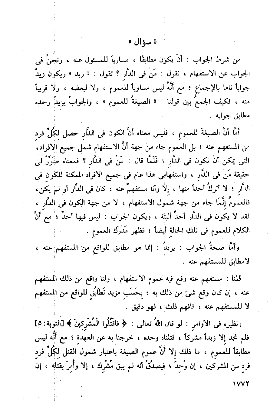 من شرط الواجب: أن يكون مطابقا، مساويا للمسئول عنه، ونحن في الجواب عن الاستفهام، نقول: من في الدار؟ تقول: (زيد) ويكون زيد جوابا تاما بالإجماع؛ مع أنه ليس مساويا للعموم، ولا لبعضه، ولا قريبا منه، فكيف الجمع بين قولنا: " الصيغة للعموم "، والجواب يريد وحده مطابق جوابه.