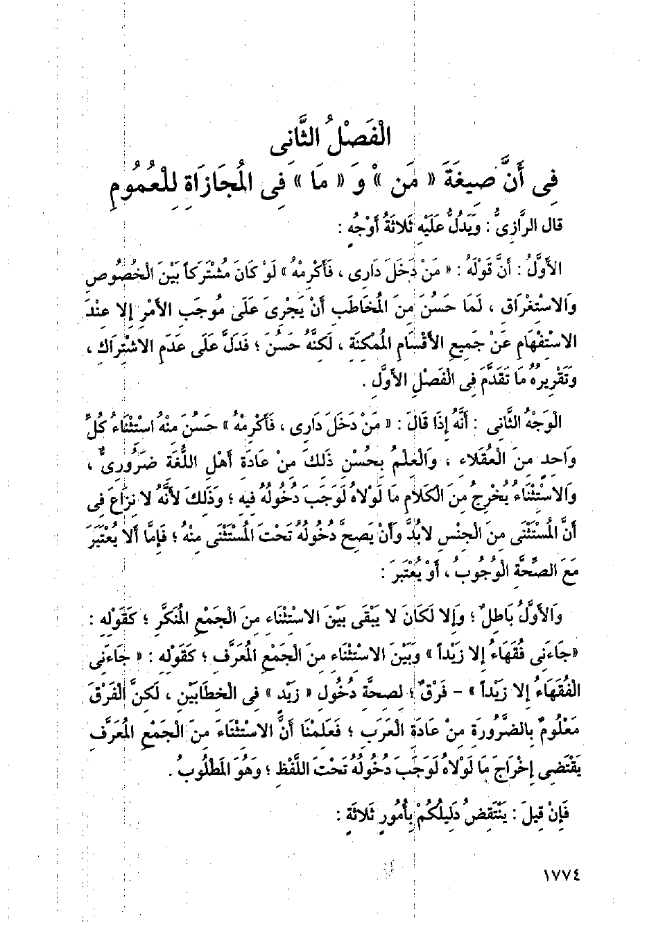 الأول: أن قوله: " من دخل داري، فأكرمه " لو كان مشتركا بين الخصوص والاستغراق، لما حسن من المخاطب أن يجري على موجب الأمر إلا عند الاستفهام عن جميع الأقسام الممكنة، لكنه حسن؛ فدل على عدم الاشتراك، وتقريره ما تقدم في الفصل الأول.