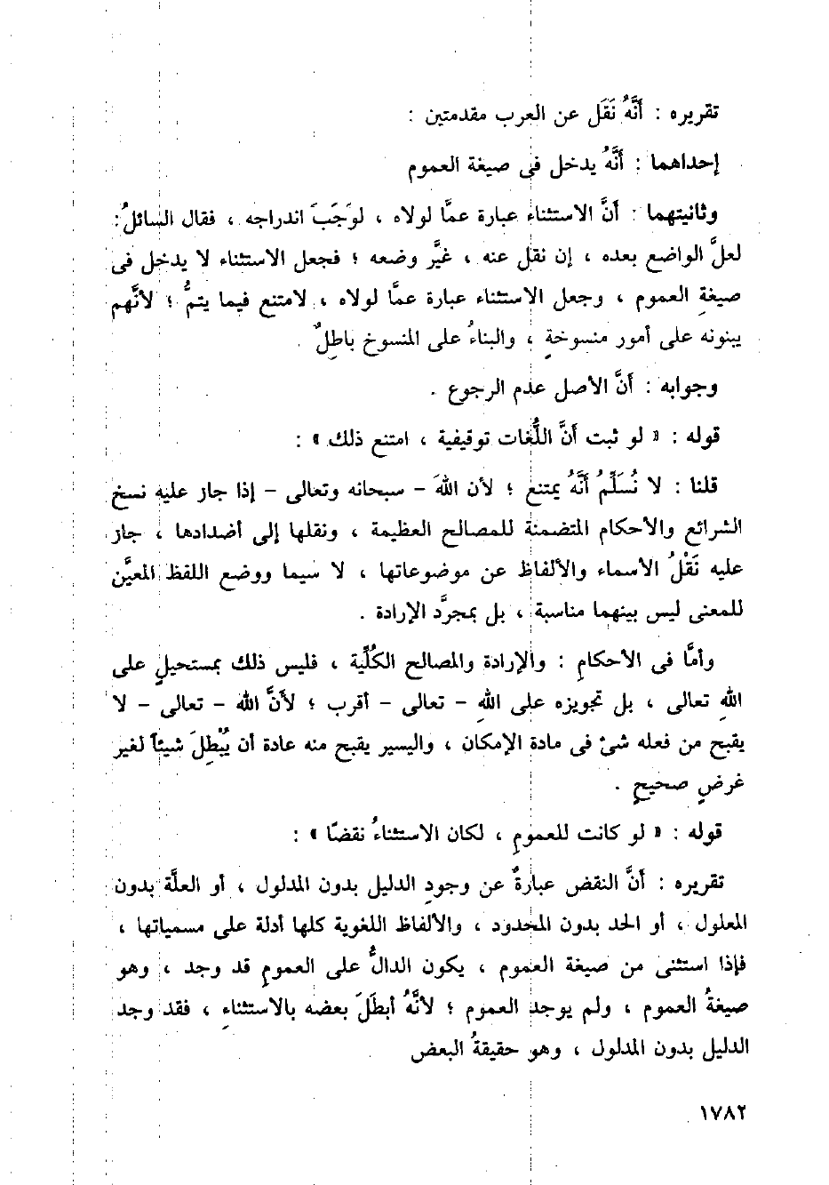 وثانيهما: أن الاستثناء عبارة عما لولاه، لوجب اندراجه، فقال السائل: لعل الواضع بعده، إن نقل عنه، غير وضعه؛ فجعل الاستثناء لا يدخل في صيغة العموم، وجعل الاستثناء عبارة عما لولاه، لامتنع فيما يتم؛ لأنهم يبنونه على أمور منسوخة، والبناء على المنسوخ باطل.