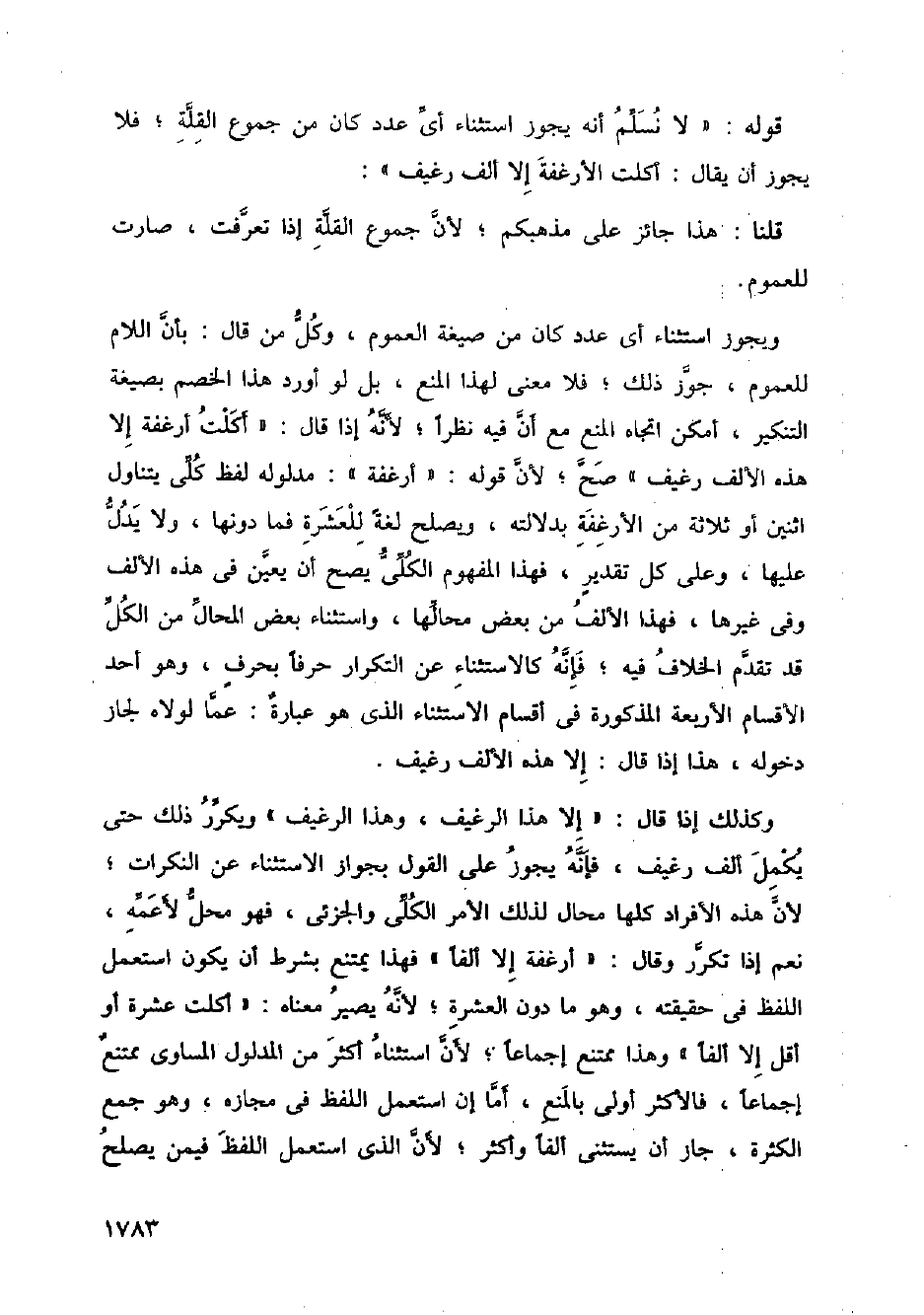 ويجوز استثناء أي عدد كان من صيغة العموم، وكل من قال: بأن اللام للعموم، جوز ذلك؛ فلا معنى لهذا المنع، بل لو أورد هذا الخصم بصيغة التنكير، أمكن اتجاه المنع مع ان فيه نظرا؛ لأنه إذا قال: " أكلت أرغفة إلا هذا الألف رغيف " صح؛ لأن قوله: (أرغفة): مدلوله لفظ كلي يتناول اثنين أو ثلاثة من الأرغفة بدلالته، ويصلح لغة للعشرة فما دونها، ولا يدل عليها، وعلى كل تقدير، فهذا المفهوم الكلي يصح أن يعين في هذه الألف وفي غيرها، فهذا الألف من بعض محالها، واستثناء بعض المحال من الكل قد تقدم الخلاف فيه؛ فإنه كالاستثناء عن التكرار حرفا بحرف، وهو أحد الأقسام الأربعة المذكورة في أقسام الاستثناء الذي هو عبارة: عما لولاه لجاز دخوله، هذا إذا قال: إلا هذه الألف رغيف.