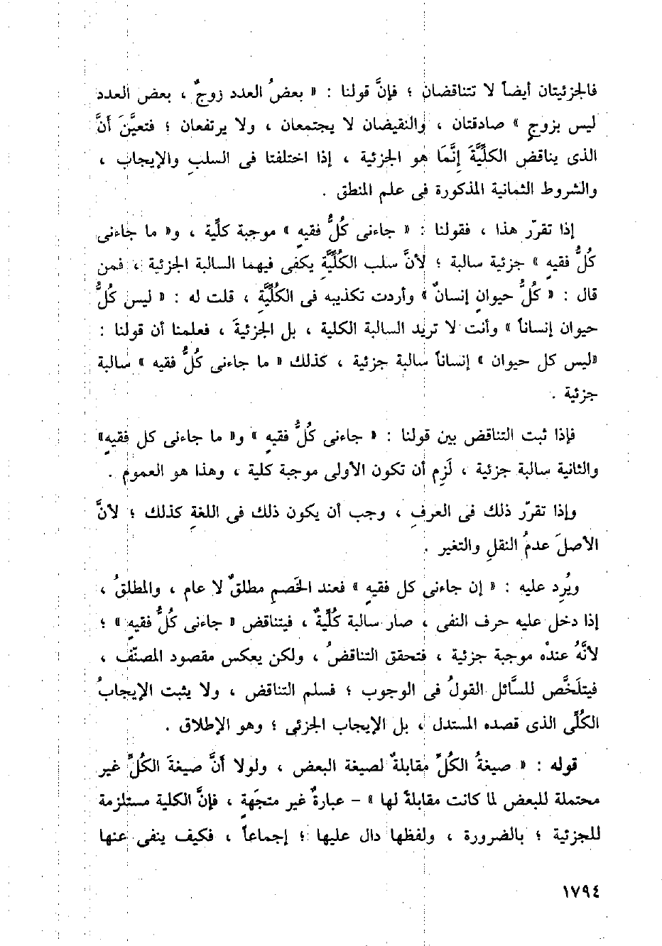 إذا تقرر هذا، فقولنا: " جاءني كل فقيه " موجبة كلية، و " ما جاءني كل فقيه " جزئية سالبة؛ لأن سلب الكلية يكفي فيهما السالبة الجزئية، فمن قال: " كل حيوان إنسان " وأردت تكذيبه في الكلية، قلت له: " ليس كل حيوان إنسانا " وأنت لا تريد السالبة الكلية، بل الجزئية، فعلمنا أن قولنا: " ليس كل حيوان " إنسانا سالبة جزئية، كذلك " ما جاءني كل فقيه " سالبة جزئية.