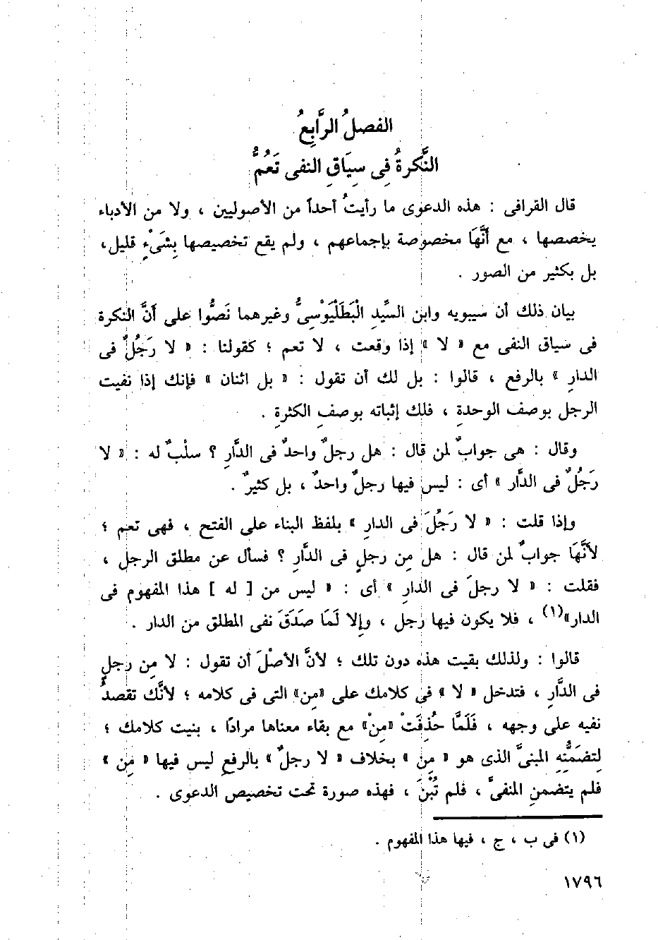 بيان ذلك أن سيبويه وابن السيد البطليوسي وغيرهما نصوا على أن النكرة في سياق النفي مع (لا) إذا وقعت، لا تعم؛ كقولنا: " لا رجل في الدار " بالرفع، قالوا: بل لك أن تقول: " بل اثنان " فإنك غذا نفيت الرجل بوصف الوحدة، فلك إثباته بوصف الكثرة.