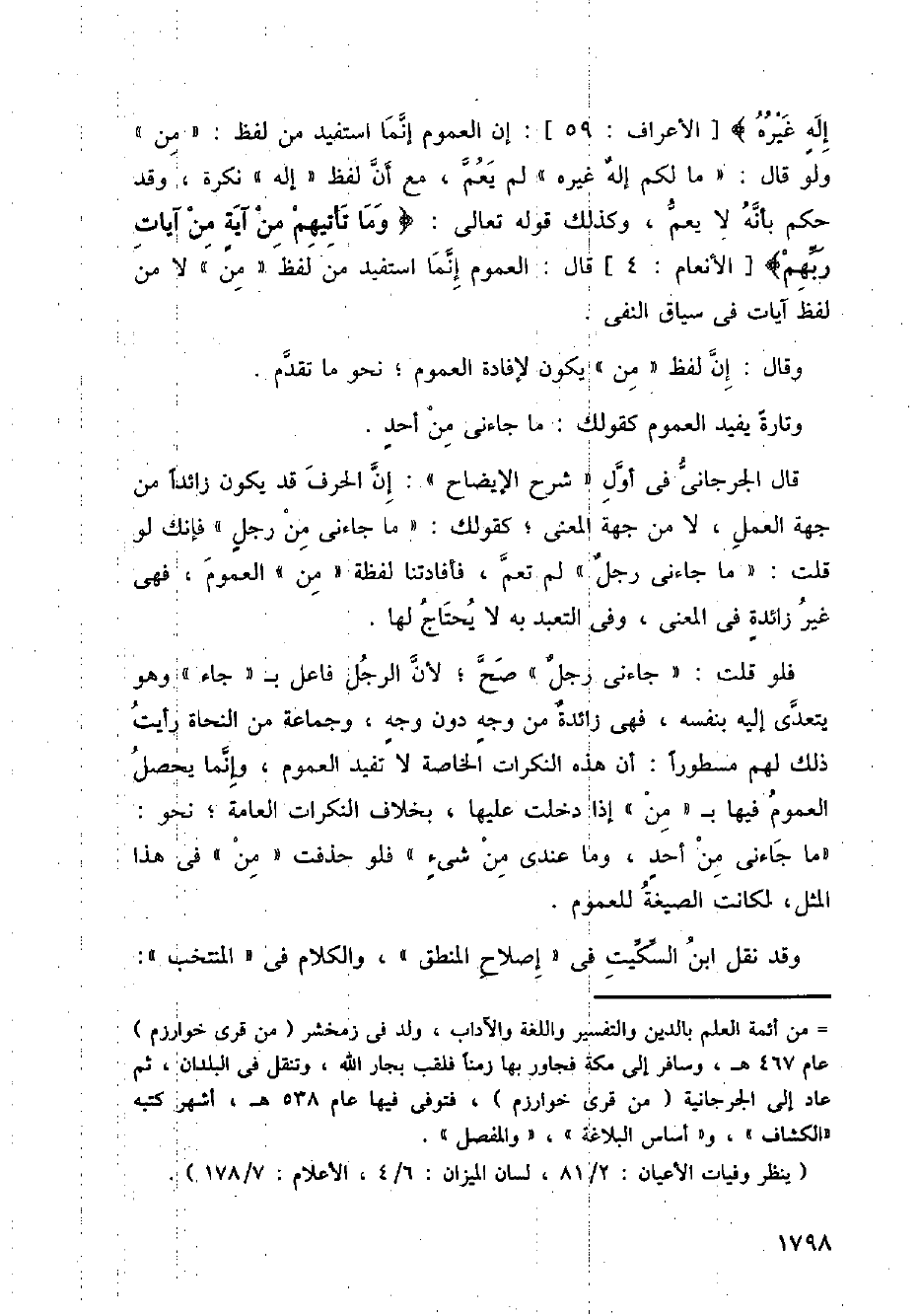 إله غيره} [الأعراف: 59]: إن العموم إنما استفيد من لفظ: (من) ولو قال: " مالكم إله غيره " لم يعمم، مع أن لفظ (إله) نكرة، وقد حكم بأنه لا يعمم، وكذلك قوله تعالى: {وما تأتيهم من آية من آيات ربهم} [الأنعام: 4] قال: العموم إنما استفيد من لفظ (من) لا من لفظ آيات في سياق النفي.