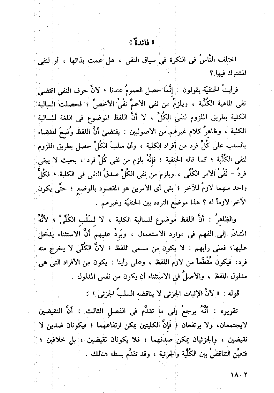فرأيت الحنفية يقولون: إنما حصل العموم عندنا؛ لأن حرف النفي اقتضى نفي الماهية الكلية، ويلزم من نفي الأعم نفي الأخص؛ فحصلت السالبة الكلية بطريق الملزوم لنفي الكل، لا أن اللفظ الموضوع في اللغة للسالبة الكلية، وظاهر كلام غيرهم من الأصوليين: يقتضي أن اللفظ وضع للقضاء بالسلب على كل فرد من أفراد الكلية، وأن سلب الكل حصل بطريق اللزوم لنفي الكلية؛ كما قاله الحنفية؛ فإنه يلزم من نفي كل فرد، بحيث لا يبقى فرد نفي الأمر الكلي، ويلزم من نفي الكل صدق النفي في الكلية؛ فكل واحد منهما لازم للآخر؛ بقى أي الأمرين هو المقصود بالوضع؛ حتى يكون الآخر لازما له؟ هذا موضع التردد بين الحنفية وغيرهم.