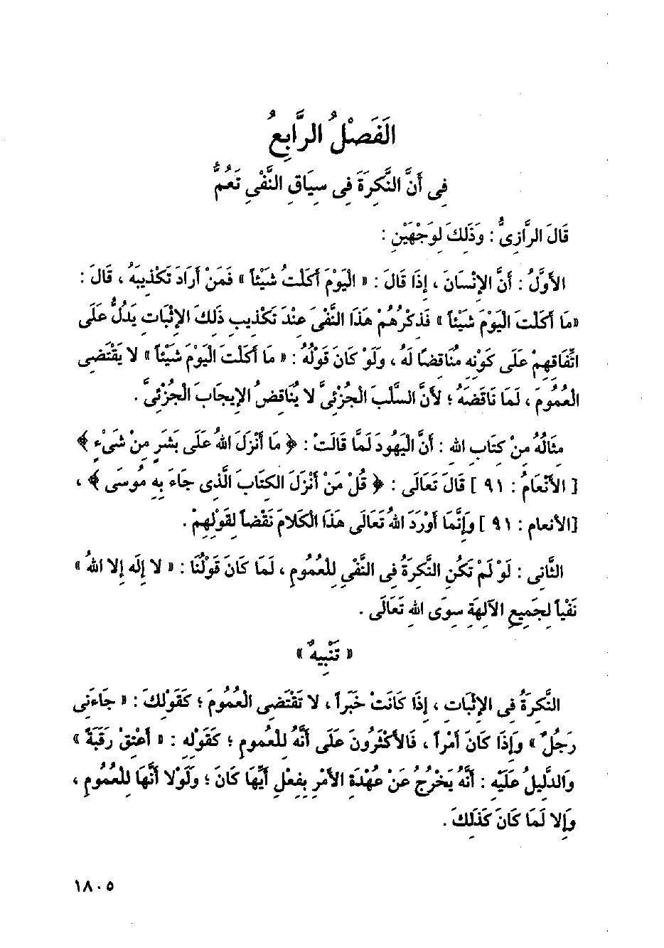 الثاني: لو لم تكن النكرة في النفي للعموم، لما كان قولنا: " لا إله إلا الله " نفيا لجميع الآلهة سوى الله تعالى.