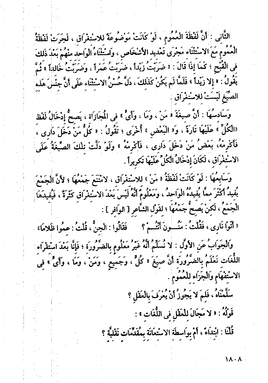 الثاني: أن لفظة العموم، لو كانت موضوعة للاستغراق، لجرت لفظة العموم مع الاستثناء مجرى تعديد الأشخاص، واستثناء الواحد منهم بعد ذلك في القبح؛ كما إذا قال: " ضربت عمرا، وضربت خالدا " ثم يقول: " إلا زيدا " فلما لم يكن كذلك، دل حسن الاستثناء على أن جنس هذه الصيغ ليست للاستغراق.