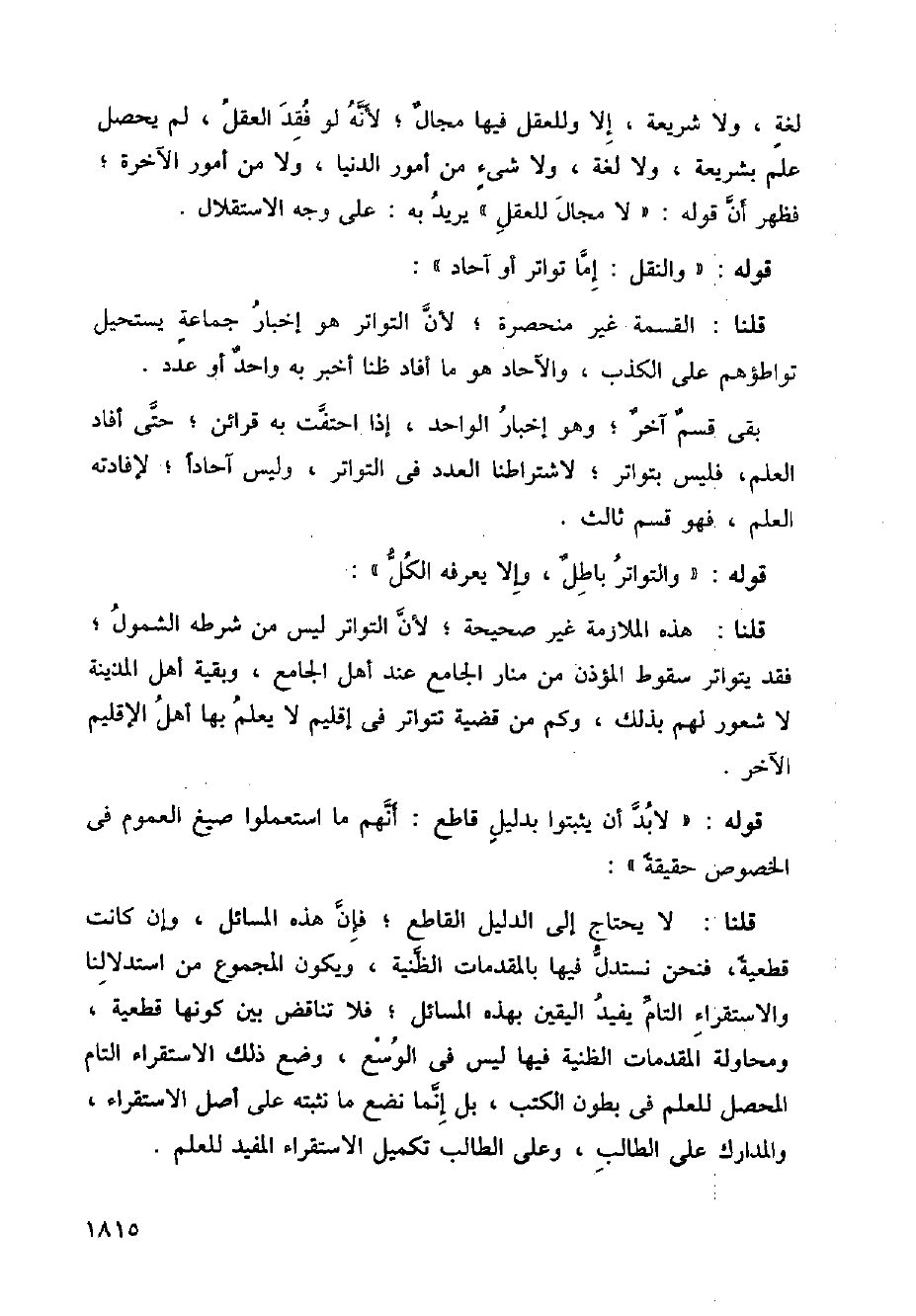 قلنا: هذه الملازمة غير صحيحة؛ لأن التواتر ليس من شرطه الشمول؛ فقد يتواتر سقوط المؤذن من منار الجامع عند أهل الجامع، وبقية أهل المدينة لا شعور لهم بذلك، وكم من قضية تتواتر في إقليم لا يعلم بها أهل الإقليم الآخر.
