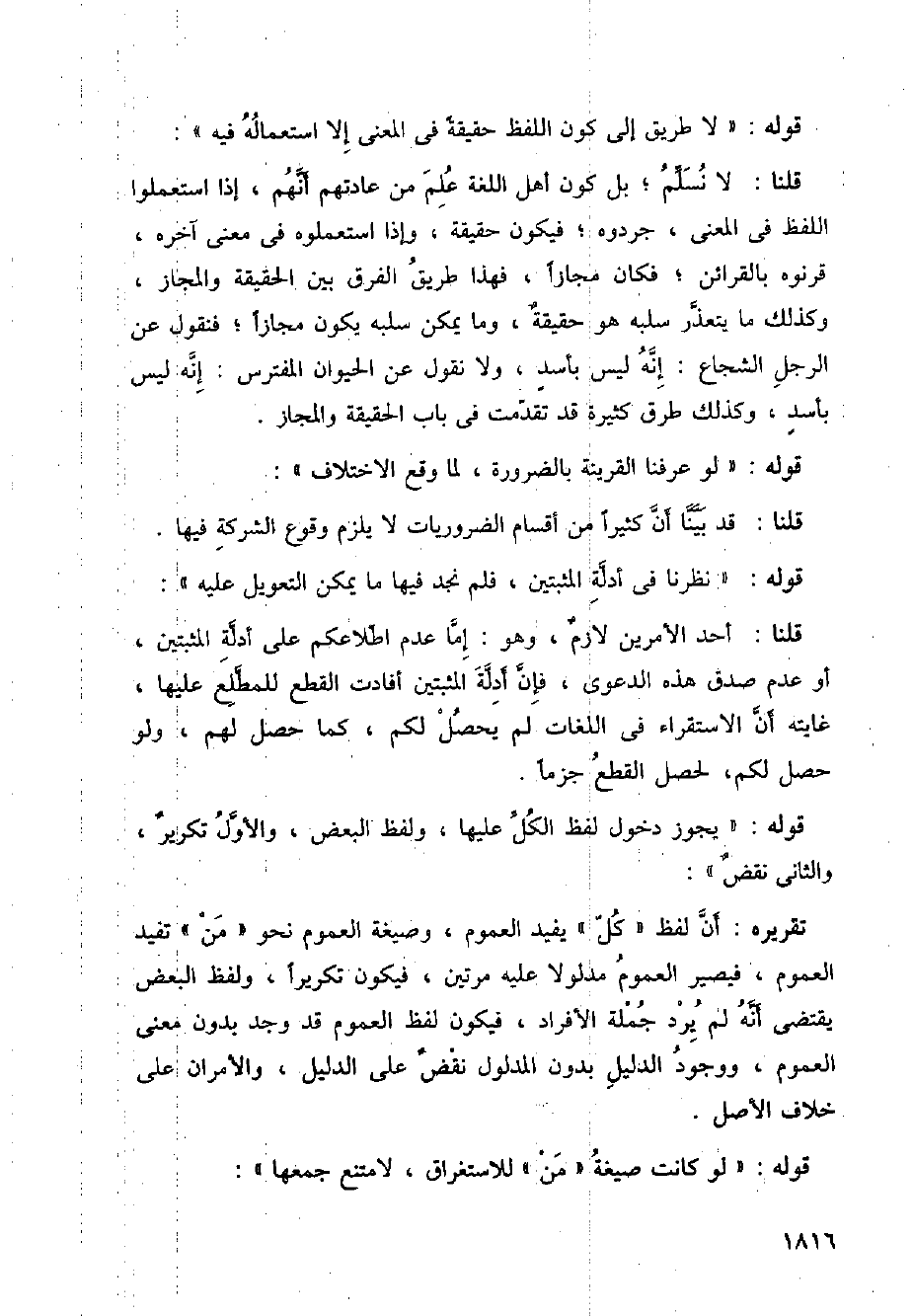 قلنا: لا نسلم؛ بل كون أهل اللغة علم من عادتهم أنهم، إذا استعملوا اللفظ في المعنى، جردوه؛ فيكون حقيقة، وإذا استعملوه في معنى آخره، قرنوه بالقرائن؛ فكان مجازا، فهذا طريق الفرق بين الحقيقة والمجاز، وكذلك ما يتعذر سلبه هو حقيقة، وما يمكن سلبه يكون مجازا؛ فنقول عن الرجل الشجاع: إنه ليس بأسد، ولا نقول عن الحيوان المفترس: إنه يلس بأسد، وكذلك طرق كثيرة قد تقدمت في باب الحقيقة والمجاز.