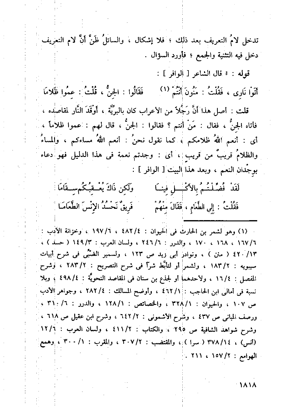 قلت: أصل هذا أن رجلا من الأعراب كان بالبرية، أوقد النار لمقاصده، فأتاه الجن، فقال: من أنتم؟ فقالوا: الجن، قال لهم: عموا ظلاما، أي: انعم الله ظلامكم، كما نقول نحن: أنعم الله مساءكم، والمساء والظلام قريب من قريب، أي: وجدتم نعمة في هذا الدليل فهو دعاء بوجدان النعم، وبعد هذا البيت [الوافر]: