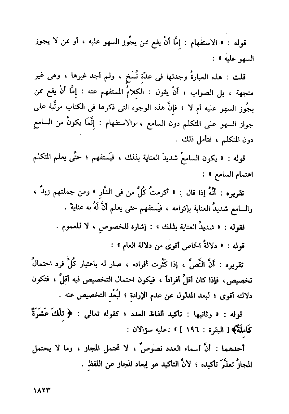 قلت: هذه العبارة وجدتها في عدة نسخ، ولم أجد غيرها، وهي غير متجهة، بل الصواب، أن يقول: الكلام المستفهم عنه: إما أن يقع ممن يجوز السهو عليه أم لا؛ فإن هذه الوجوه التي ذكرها في الكتاب مرتبة على جواز السهو على المتكلم دون السامع، والاستفهام: إنما يكون من السامع دون المتكلم، فتأمل ذلك.