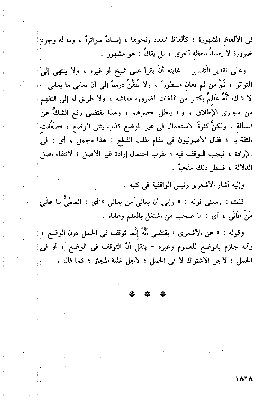 وعلى تقدير التفسير: غايته ان يقرأ على شيخ أو غيره، ولا ينتهي إلى التواتر، ثم من لم يعان مسطورا، ولا يلقن درسا إلى أن يعاني ما يعاني لا شك أنه عالم بكثير من اللغات لضرورة معاشه، ولا طريق له إلى التفهم من مجازي الإطلاق، وبه يبطل حصرهم، وهذا يقتضي رفع الشك عن المسألة، ولكن كثرة الاستعمال في غير الموضع كذب يثني الوضع؛ فضعفت الثقة به؛ فقال الأصوليون في مقام طلب القطع: هذا مجمل، أي: في الإرادة، فيجب التوقف فيه؛ لقرب احتمال إرادة غير الأصل؛ لانتفاء أصل الدلالة، فسطر ذلك مذهبا.