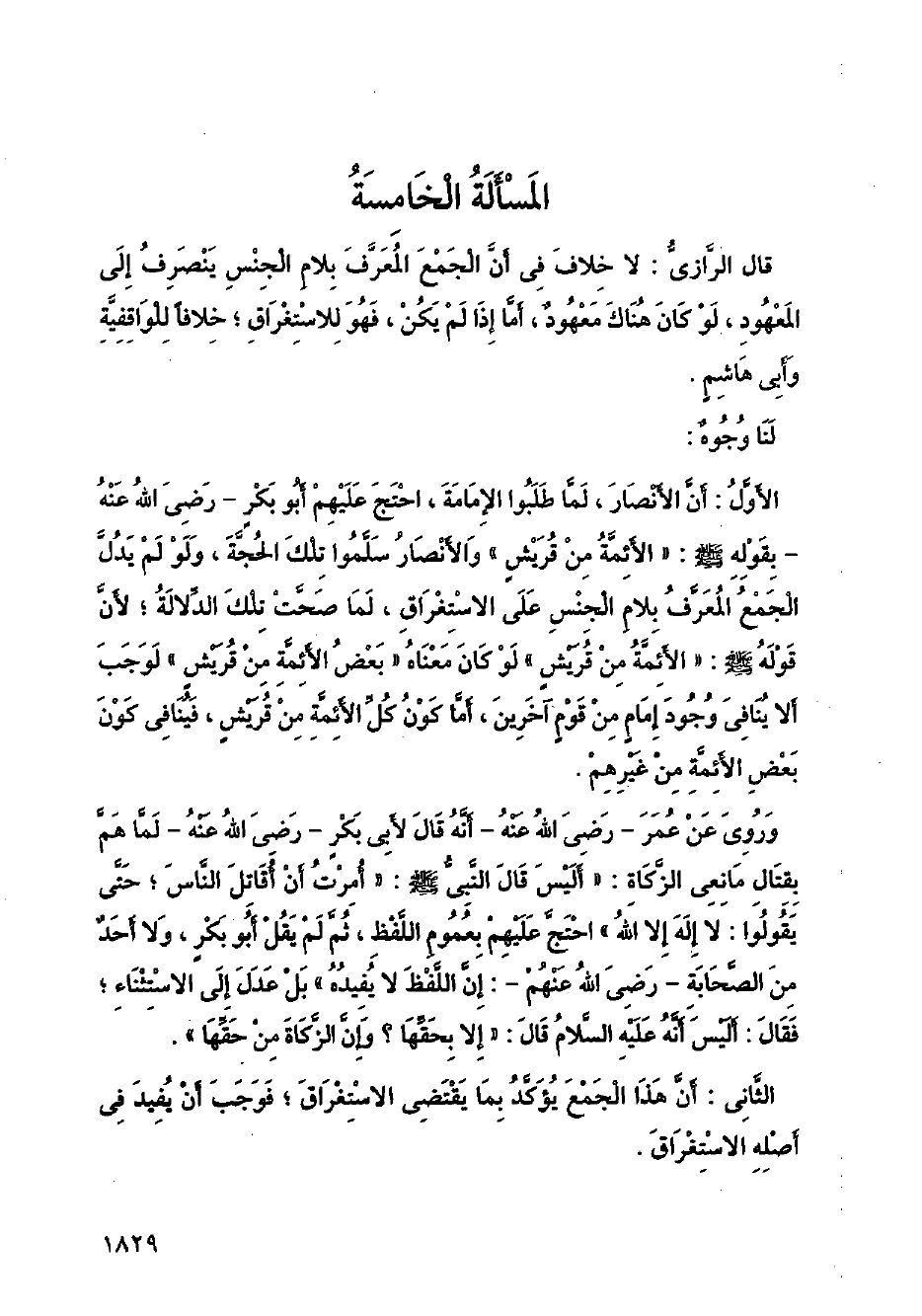 الأول: أن الأنصار، لما طلبوا الإمامة، احتج عليهم أبو بكر رضي الله عنه بقوله صلى الله عليه وسلم: " الأئمة من قريش " والأنصار سلموا تلك الحجة، ولو لم يدل الجمع المعرف بلام الجنس على الاستغراق، لما صحت تلك الدلالة؛ لأن قوله صلى الله عليه وسلم: " الأئة من قريش " لو كان معناه " بعض الأئمة من قريش " لوجب ألا ينافي وجود إمام من قوم آخرين، أما كون كل الأئمة من قريش، فينافي كون بعض الأئمة من غيرهم.