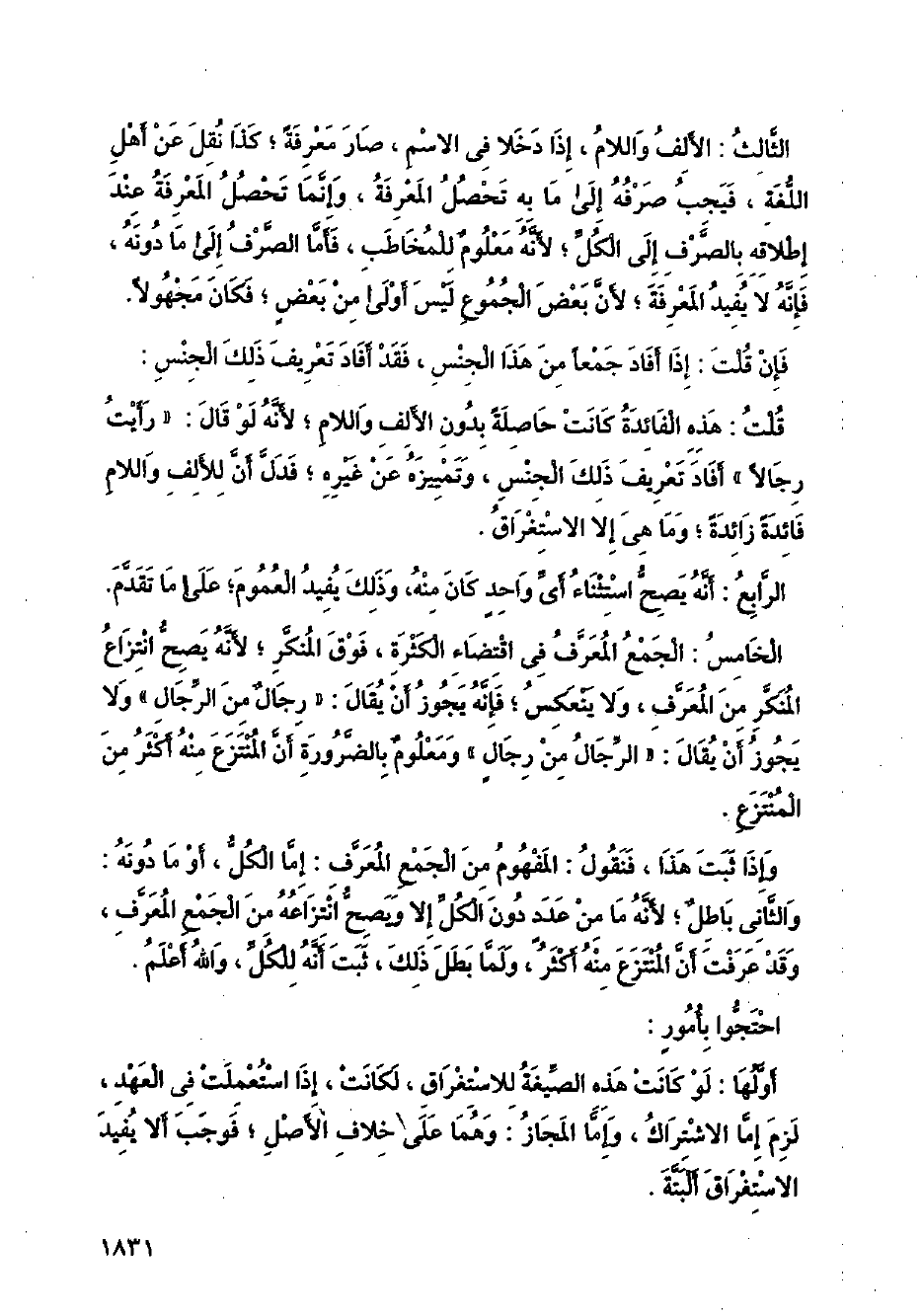 وإذا ثبت هذا، فنقول: المفهوم من الجمع المعرف: إما الكل، أو ما دونه: والثاني باطل؛ لأنه ما من عدد دون الكل إلا ويصح انتزاعة من الجمع المعرف، وقد عرفت أن المنتزع منه أكثر، ولما بطل ذلك، ثبت أنه للكل، والله أعلم.